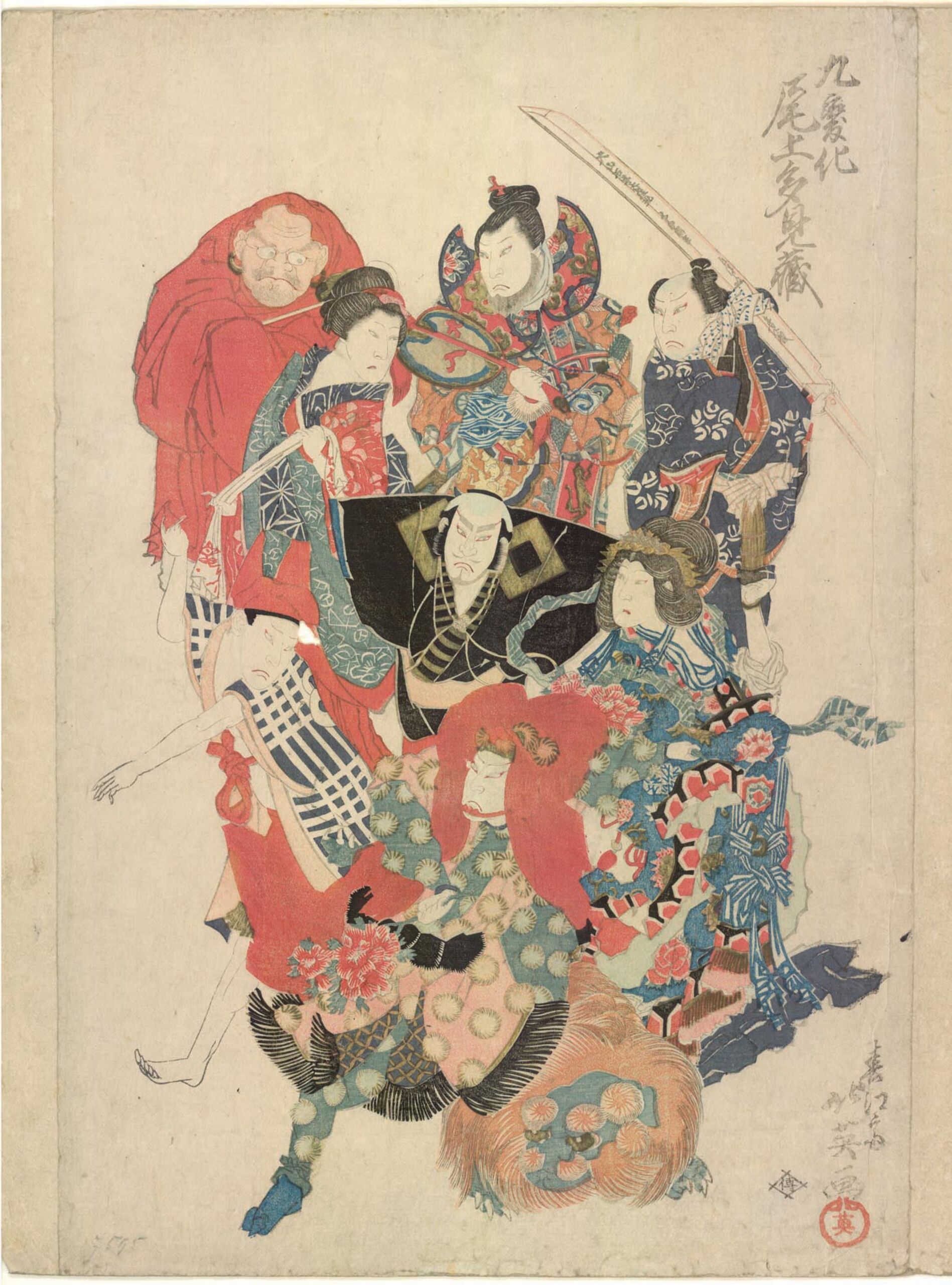Shunkōsai Hokueiga 春江斎北英画 Der hauptsächlich in der kamigata*-Region tätige Kabuki-Schauspieler Onoe Tamizō II 二代目尾上多見蔵 (1799-1886) in (laut Titel) neun verschiedenen Rollen, hier jedoch sind nur acht verschiedene Rollen dargestellt. Stücke oder Tänze, bei denen die Schauspieler vor dem Publikum ganz schnell ihr Kostüm/ihre Rolle wechselten (hengemono 変化物) waren/sind bei den Besuchern des Kabuki-Theaters sehr beliebt. Diese Stücke haben meist keinen durchgehenden Handlungsstrang, sondern setzen sich aus mehreren Bildern zusammen, die verschiedenen Konzepten zugrunde liegen wie z. B.: die vier Jahreszeiten, die fünf großen Feste, die zwölf Monate, etc. Onoe Tamizō II. gehörte zu jenen Schauspielern, die berühmt dafür waren, dass sie jede Rolle spielen konnten, eine Fähigkeit, die vom Publikum hoch geschätzt wurde. Unter den acht auf dem Bild dargestellten Rollen finden sich zwei Frauenrollen, wobei die Frau rechts im blauen Gewand mit dem Musikinstrument shō 笙 (= Sheng, Instrument der traditionellen chinesischen Musik, eine Art Mundorgel) in der Hand und einem Band um die Schultern wie ein Himmelswesen erscheint. Ganz vorne ein Löwentänzer aus dem Tanzstück „Shakkyō 石橋“ mit den typischen Attributen Löwenmaske und Päonien. Ganz links hinten Tamizō als der erste Zen-Patriarch Daruma. Rechts daneben in einem chinesischen Kostüm. Blatt aufkaschiert. *kamigata 上方 ist die Bezeichnung für die Region Kyōto/Ōsaka in der Edo-Zeit.