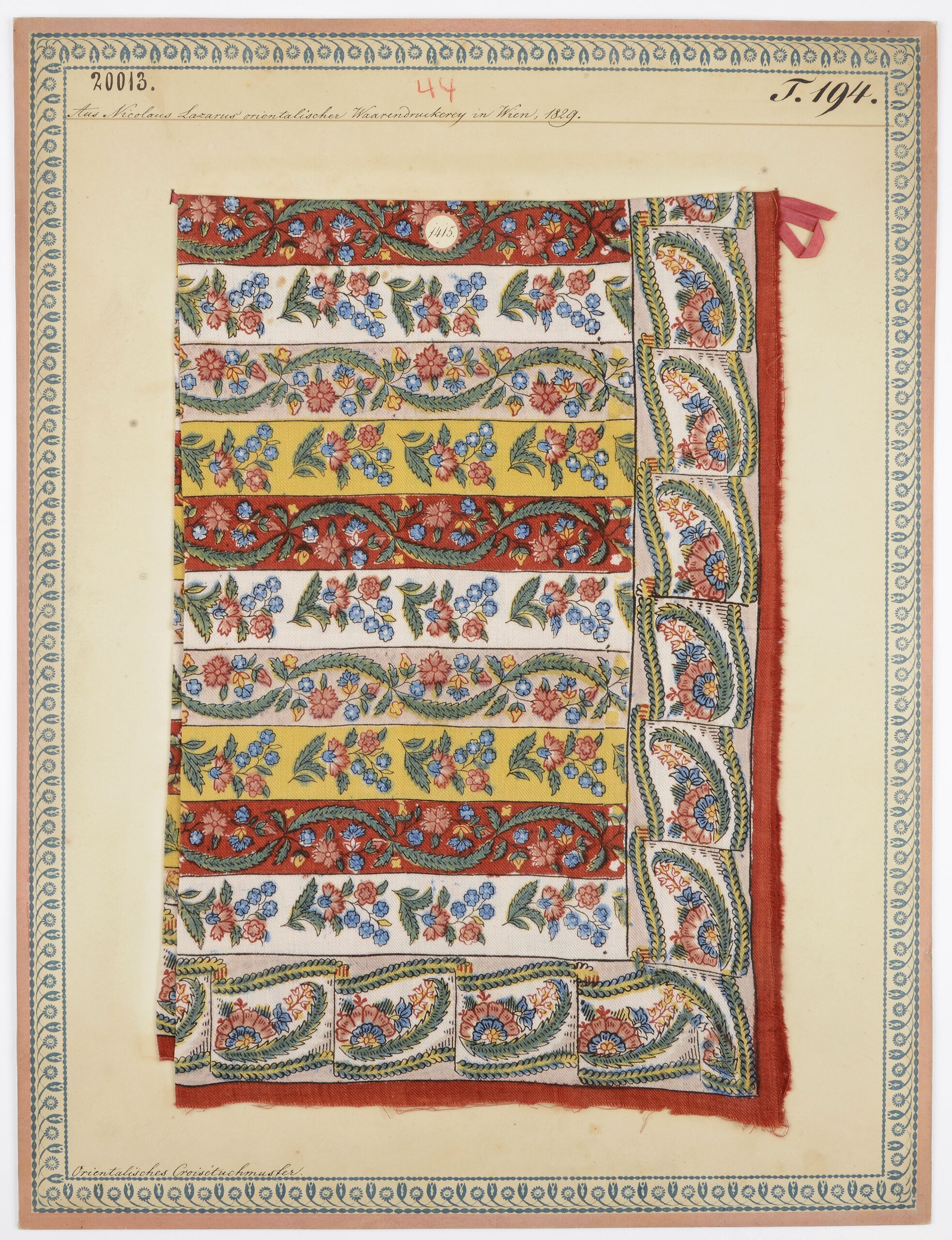 - Beschriftung (Vorderseite) : Aus Nicolaus Lazarus orientalischer Waarendruckerei in Wien, 1839. / Orientalisches Croisétüchelmuster.