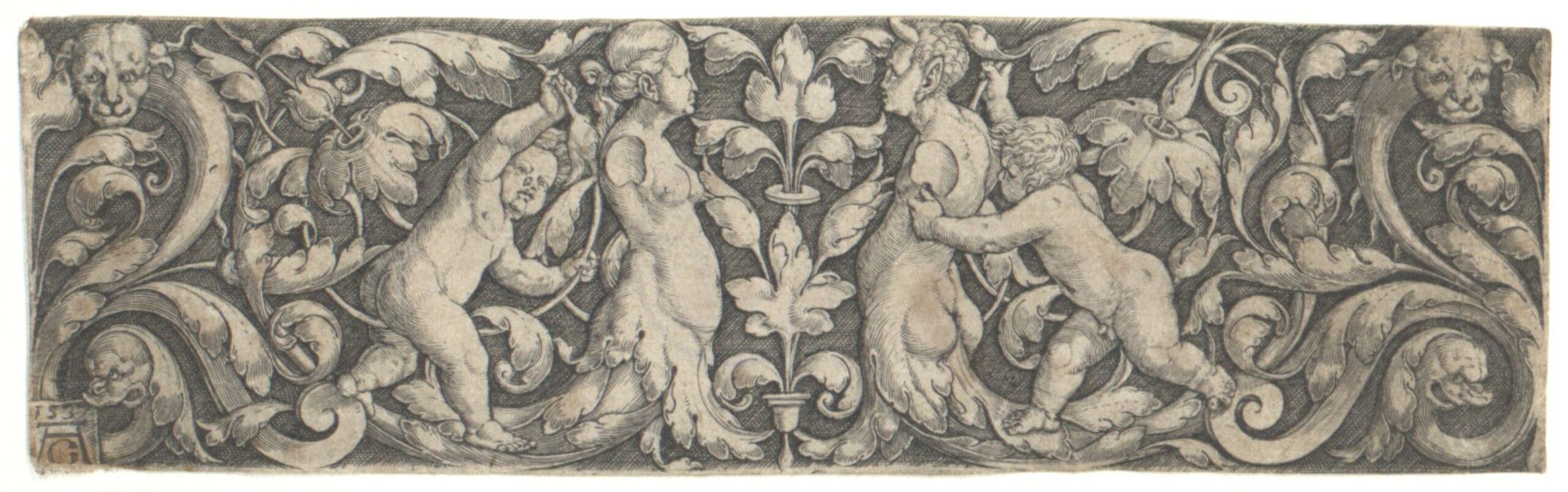 Ornamentstich, Ornament mit männlicher und weiblicher Halbfigur, unten in Laubwerkwindungen ausgehend, auf denen je ein Putto steht, Heinrich Aldegrever, MAK Inv.nr. KI 261