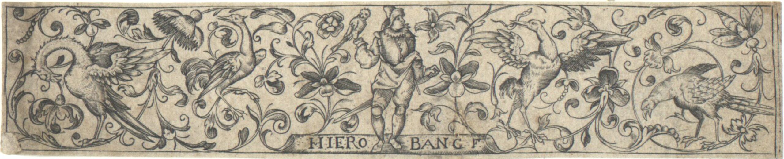 Ornamentstich, Ornamentfries mit Tieren und einem Vogelfänger, Blatt aus der Folge von neun Ornamentfriesen mit Pflanzenwindungen und Tieren., Hieronymus Bang, MAK Inv.nr. KI 1653-1