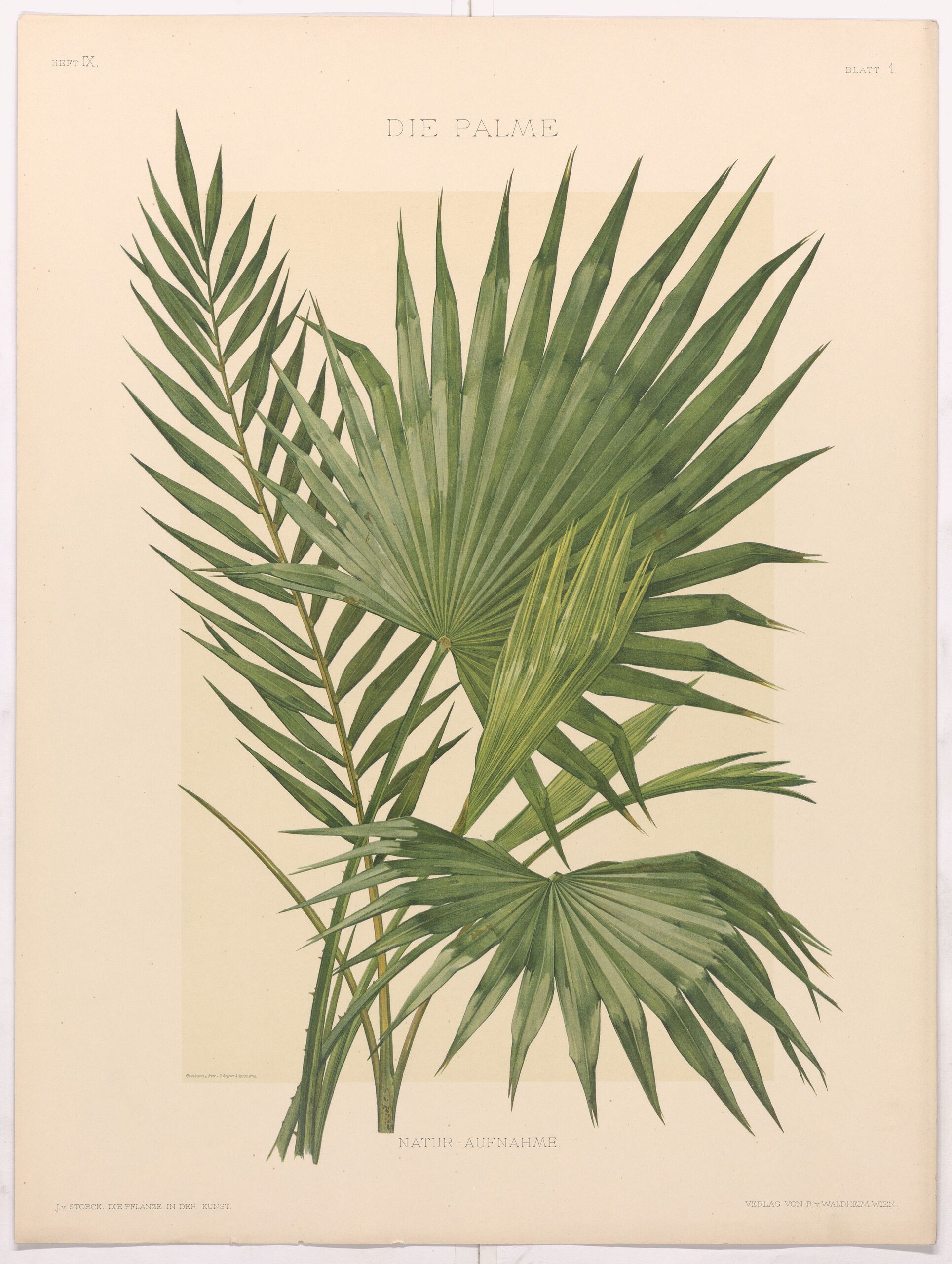 - Text am Objekt: HEFT IX; BLATT 1; DIE PALME; NATUR-AUFNAHME.; J. v. STORCK Die Pflanze in der Kunst.; VERLAG VON R. v. WALDHEIM WIEN.; Photochromie u. Druck v. C. Angerer & Göschl, Wien