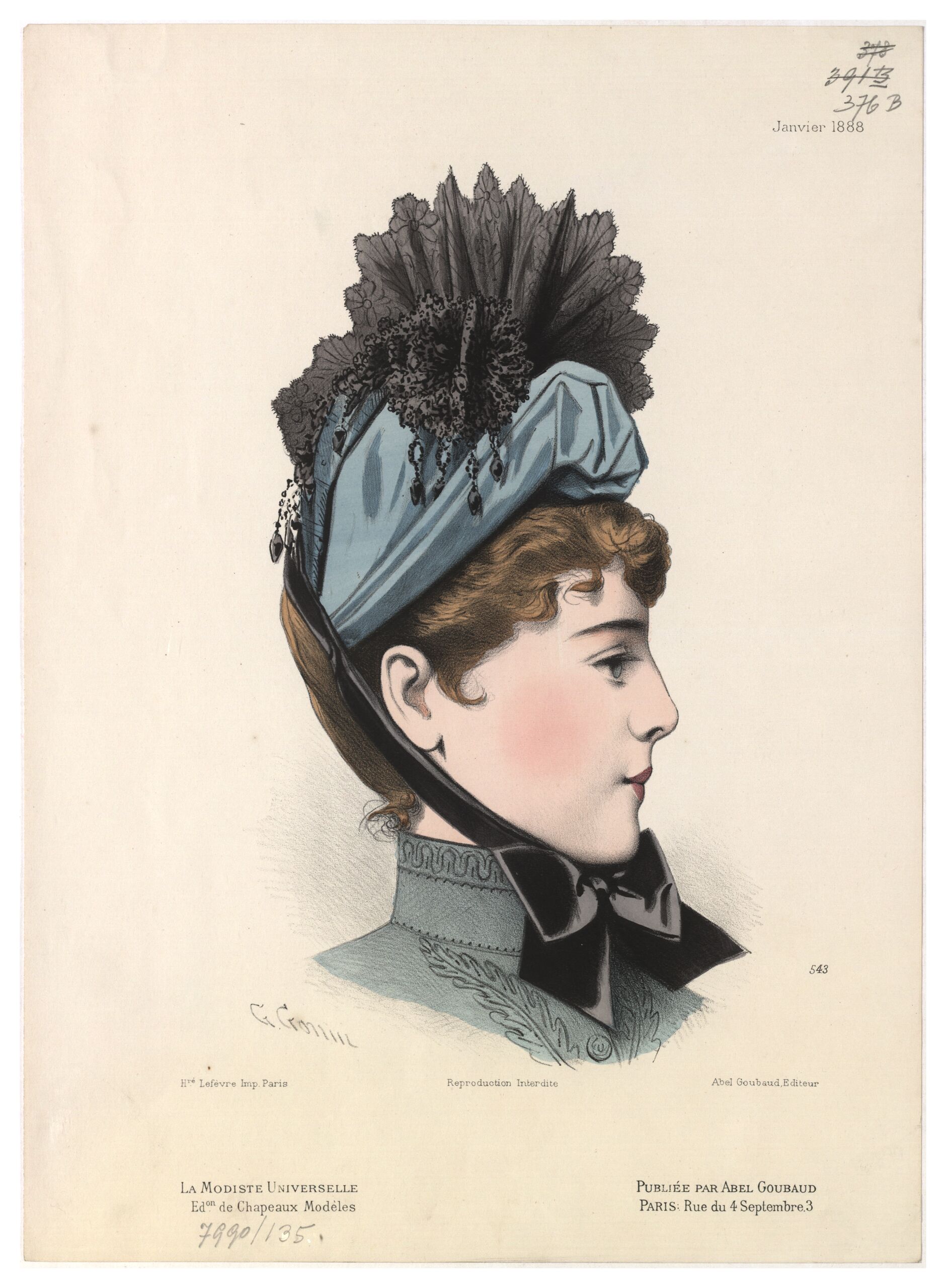 • Text am Objekt: [Links unten:] G. Gonin / Hré. Lefèvre, Imp. Paris. / La Modiste Universelle. / Edon. de Chapeaux Modèles [Unten in der Mitte:] Reproduction Interdite [Rechts oben:] Janvier 1888 [Rechts unten:] 543 / Abel Goubaud, Editeur / Publiée par Abel Goubaud / Paris: Rue du 4 Septembre, 3 [Gedruckter Text]
