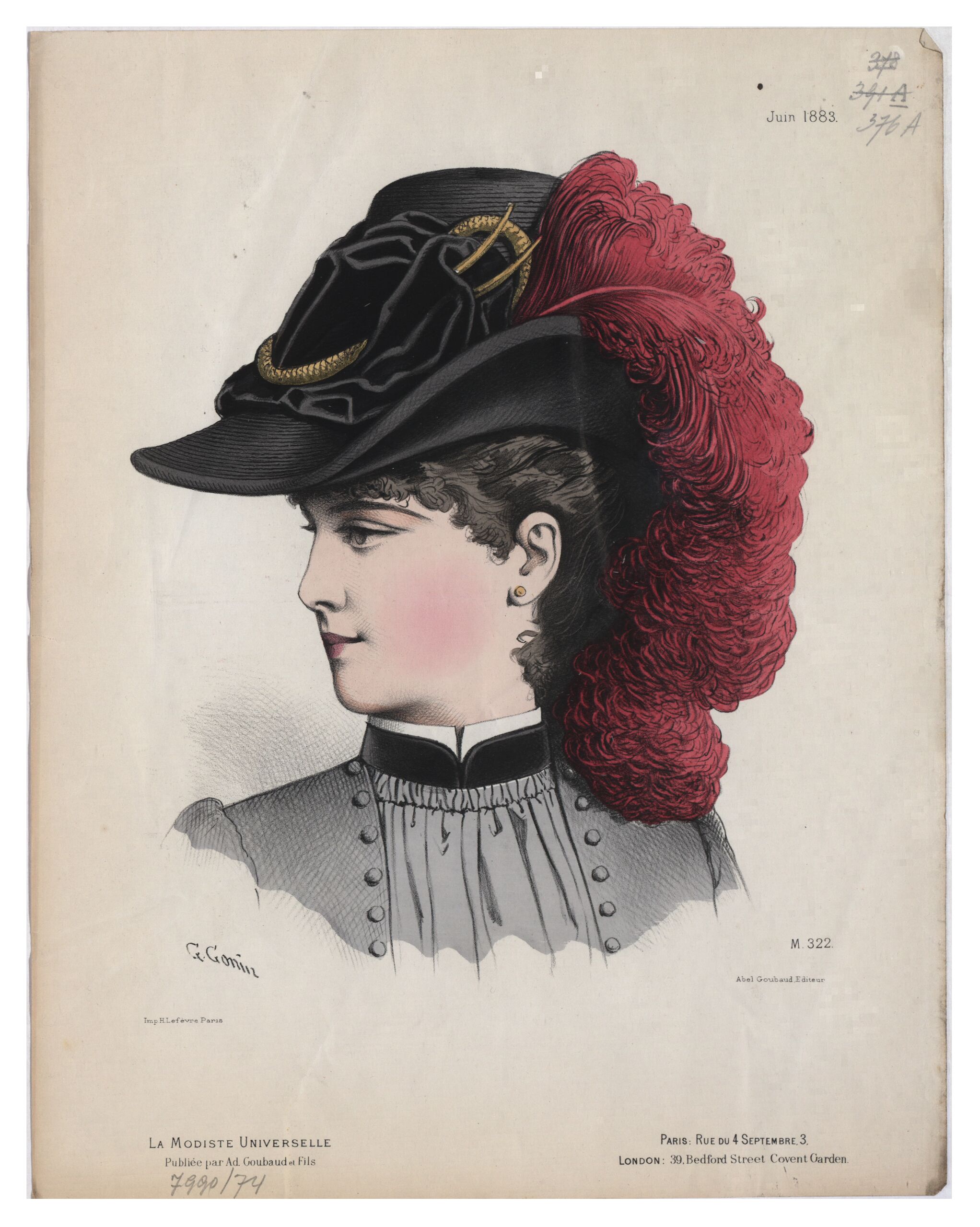 - Text am Objekt: [Links unten:] G. Gonin / Imp. H. Lefèvre Paris / La Modiste Universelle / Publiée par Ad. Goubaud et Fils [Rechts oben:] Juin 1883. [Rechts unten:] M. 322. / Abel Goubaud, Editeur / Paris: Rue du 4 Septembre, 3, / London: 39, Bedford Street Covent Garden. [Gedruckter Text]
