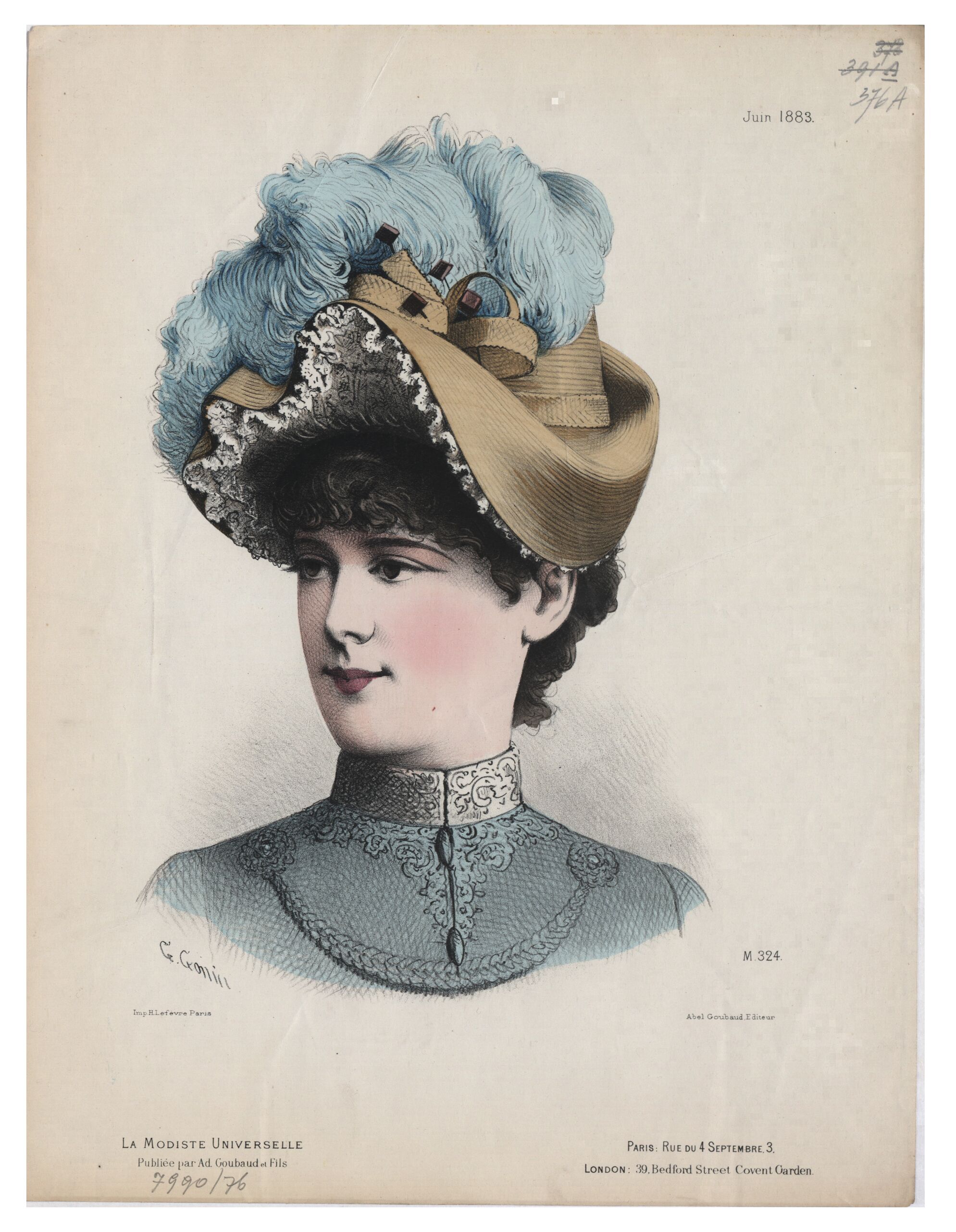 - Text am Objekt: [Links unten:] G. Gonin / Imp. H. Lefèvre Paris / La Modiste Universelle / Publiée par Ad. Goubaud et Fils [Rechts oben:] Juin 1883. [Rechts unten:] M. 324. / Abel Goubaud, Editeur / Paris: Rue du 4 Septembre, 3, / London: 39, Bedford Street Covent Garden. [Gedruckter Text]