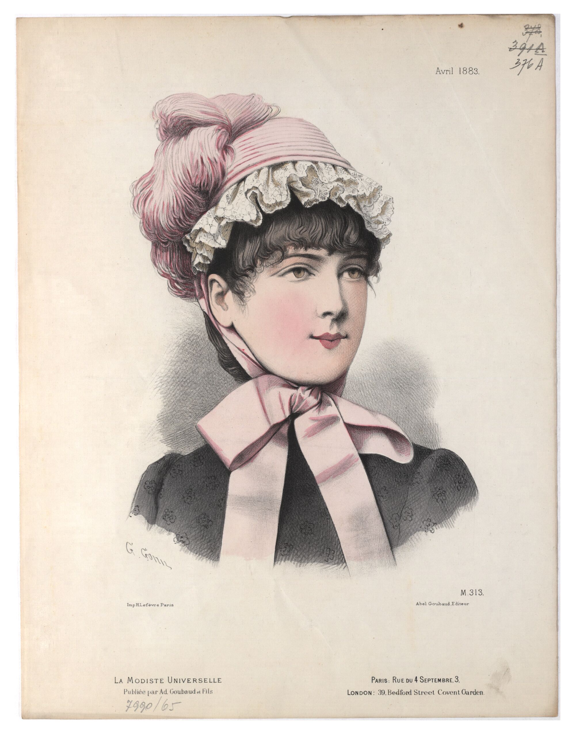 - Text am Objekt: [Links unten:] G. Gonin / Imp. H. Lefèvre Paris / La Modiste Universelle / Publiée par Ad. Goubaud et Fils [Rechts oben:] Avril 1883. [Rechts unten:] M. 313. / Abel Goubaud, Editeur / Paris: Rue du 4 Septembre, 3, / London: 39, Bedford Street Covent Garden. [Gedruckter Text]