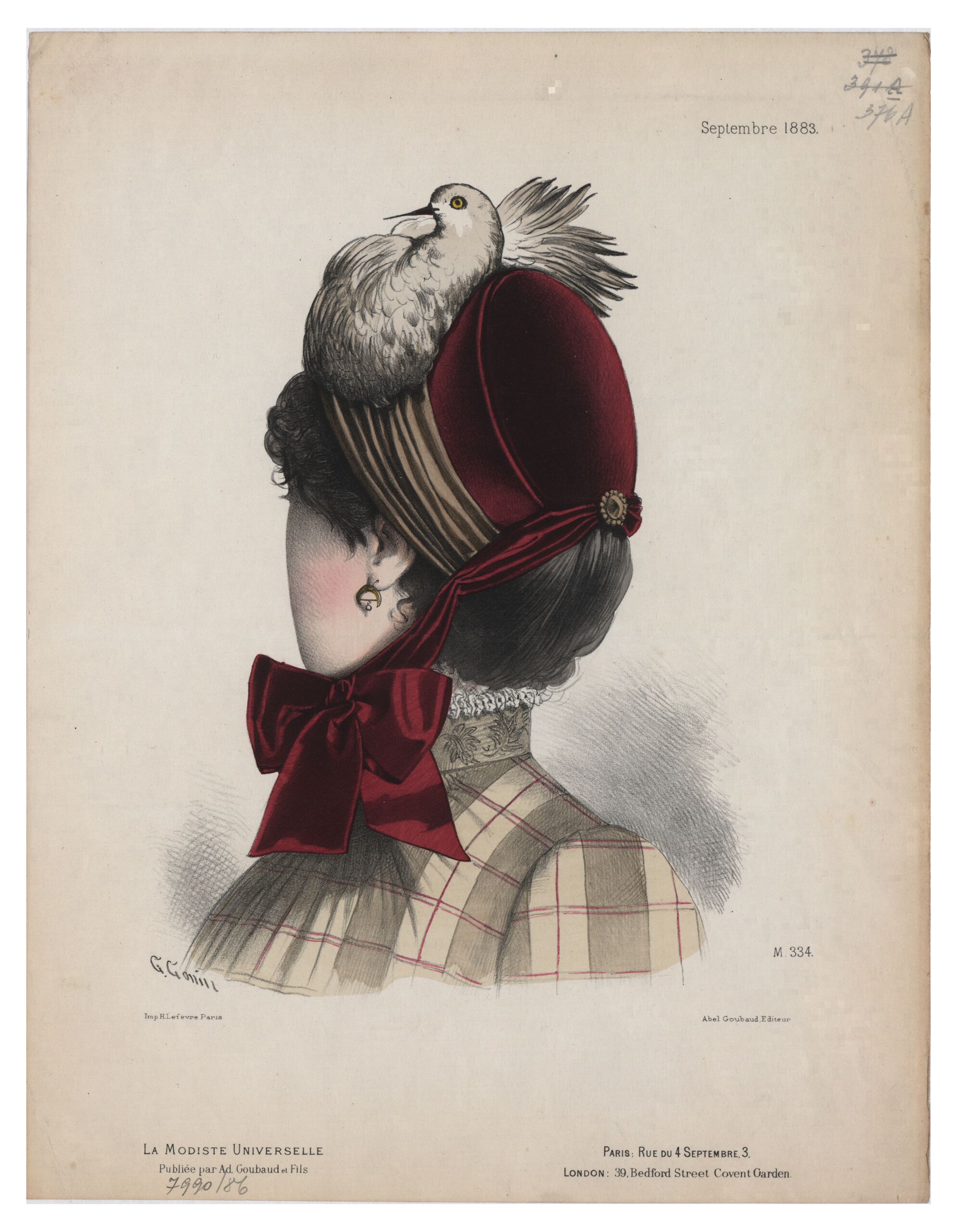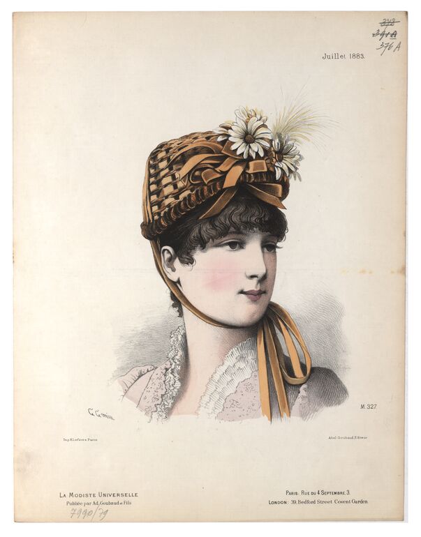 • Text am Objekt: [Links unten:] G. Gonin / Imp. H. Lefèvre Paris / La Modiste Universelle / Publiée par Ad. Goubaud et Fils [Rechts oben:] Septembre 1883. [Rechts unten:] M. 334. / Abel Goubaud, Editeur / Paris: Rue du 4 Septembre, 3, / London: 39, Bedford Street Covent Garden. [Gedruckter Text]