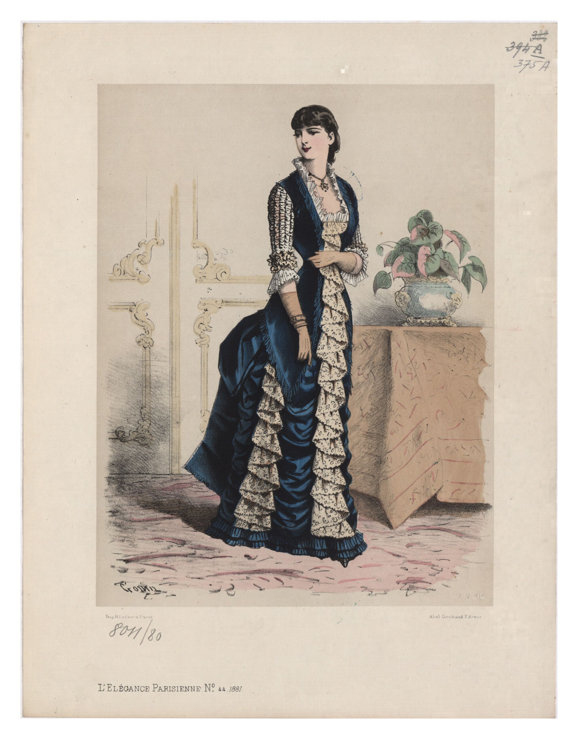 - Text am Objekt: [Links unten:] G. Gonin / Imp. H. Lefèvre, Paris. / L'Élégance Parisienne No. 44. 1881 [Rechts unten:] L.N. 318. / Abel Goubaud Editeur [Gedruckter Text]