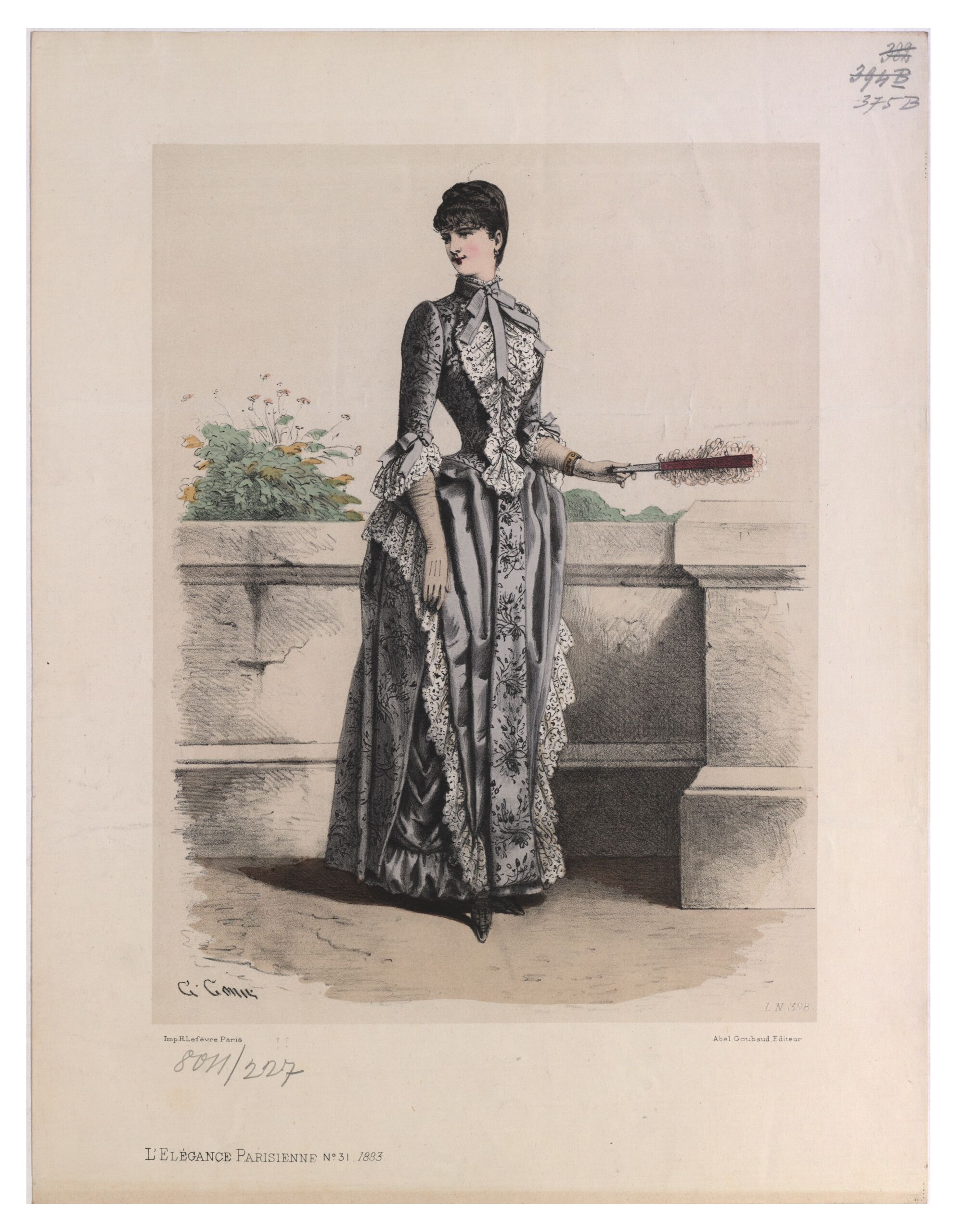 - Text am Objekt: [Links unten:] G. Gonin / Imp. H. Lefèvre, Paris. / L'Élégance Parisienne No. 31. 1883. [Rechts unten:] L.N. 398. / Abel Goubaud Editeur [Gedruckter Text]