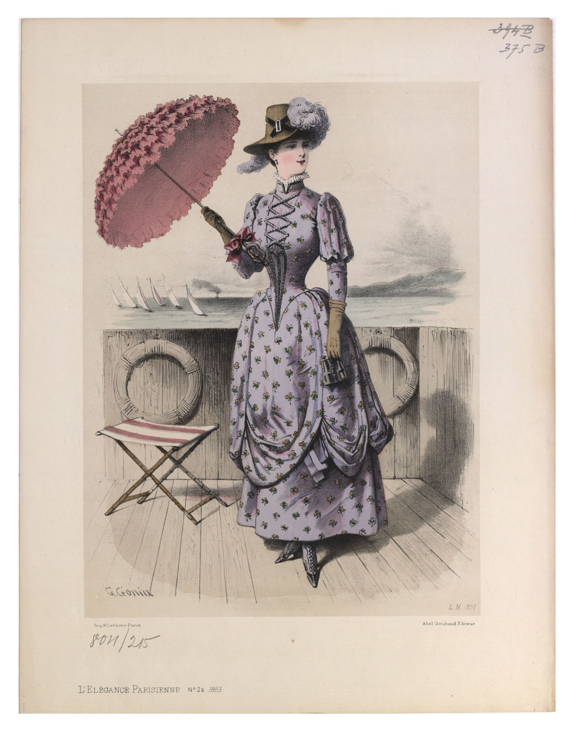 - Text am Objekt: [Links unten:] G. Gonin / Imp. H. Lefèvre, Paris. / L'Élégance Parisienne No. 24. 1883. [Rechts unten:] L.N. 391. / Abel Goubaud Editeur [Gedruckter Text]