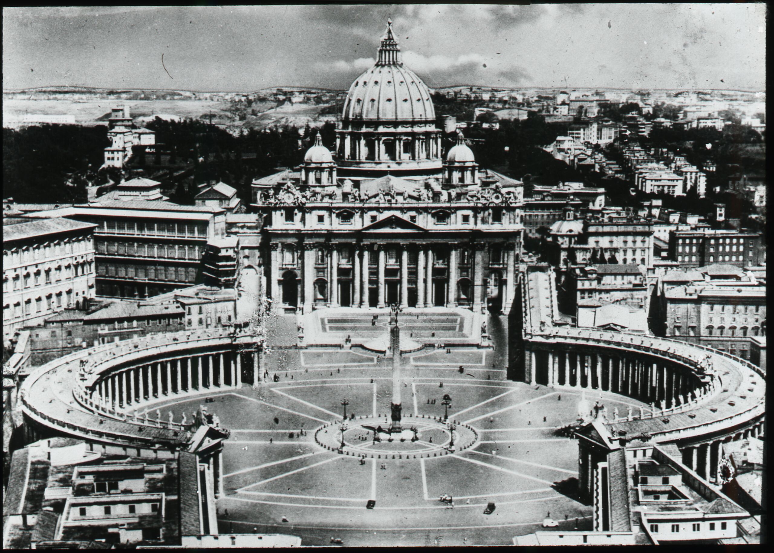 - Außenansicht des Petersdoms; im Hintergrund der Petersdom (Sankt Peter im Vatikan; Basilica Papale di San Pietro in Vaticano), im Vordergrund der Petersplatz (Piazza San Pietro) (vom Bearbeiter vergebener Titel)