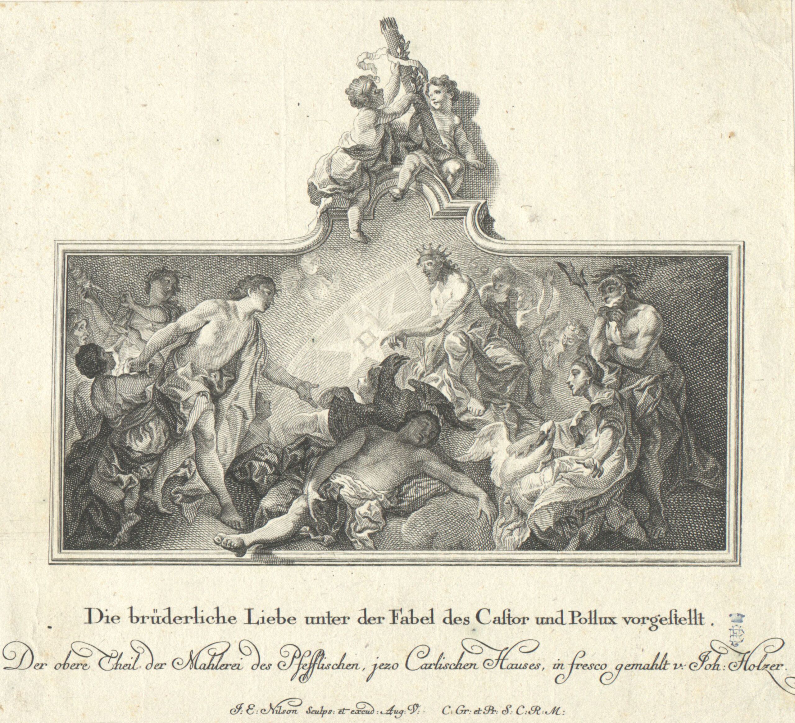 - Text am Objekt: Die brüderliche Liebe unter der Fabel des Castor und Pollux vorgestellt. / Der obere Theil der Mahlerei des Pfefflischen, jezo Carlischen Hauses, in fresco gemahlt v. Joh. Holzer. / J. E. Nilson Sculps. et excud. Aug. V. / C. Gr. et Pr. S. C. R. M.