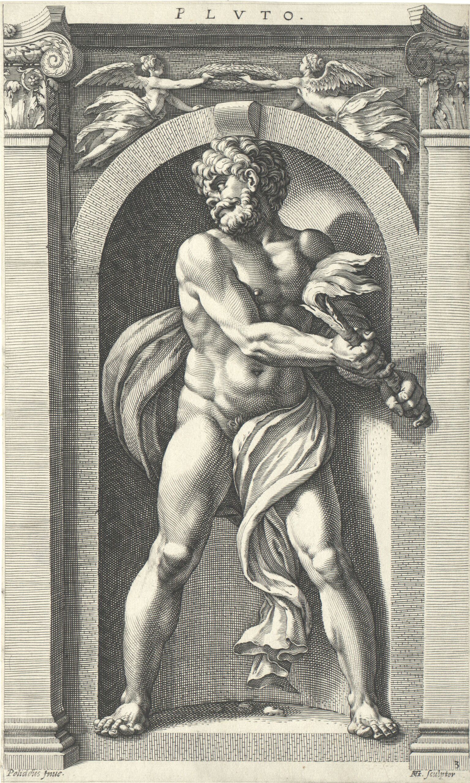 - Pluto, Blatt 3 aus der Folge der antiken Götter, nach den Fresken von Polidoro da Caravaggio am Monte Cavallo in Rom (vom Bearbeiter vergebener Titel)