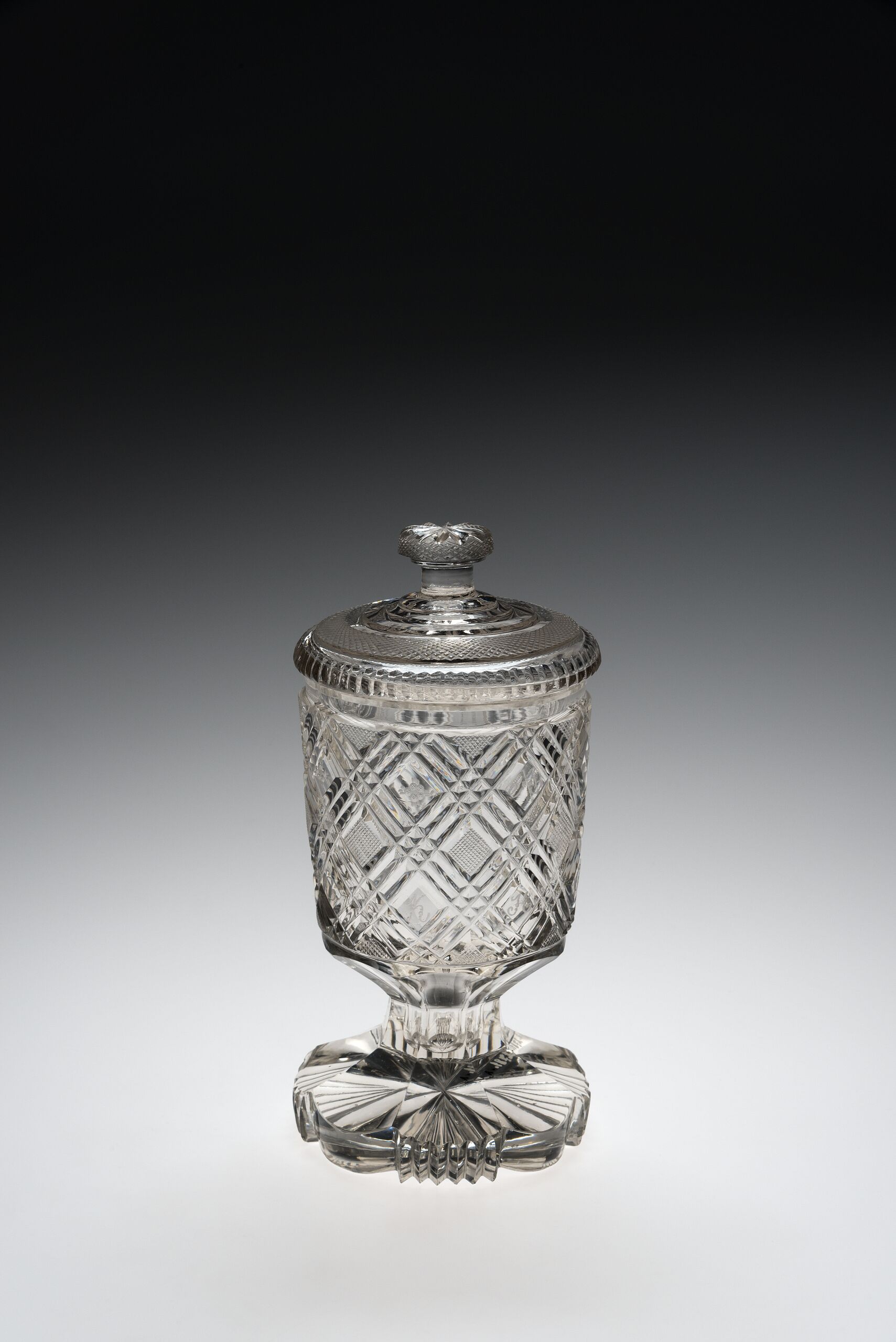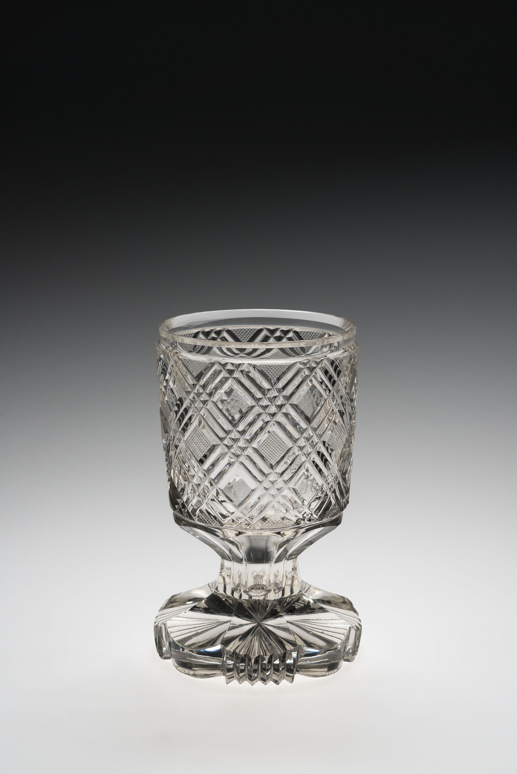 auf Fuss mit Schliff. Schnitt. Kuppa in Ranken zerlegt, trägt die Aufschrift: "Anton Horzinek". achtseitiger Fuss, jede zweite Seite tief gezahnt, gleiches Bodenmuster