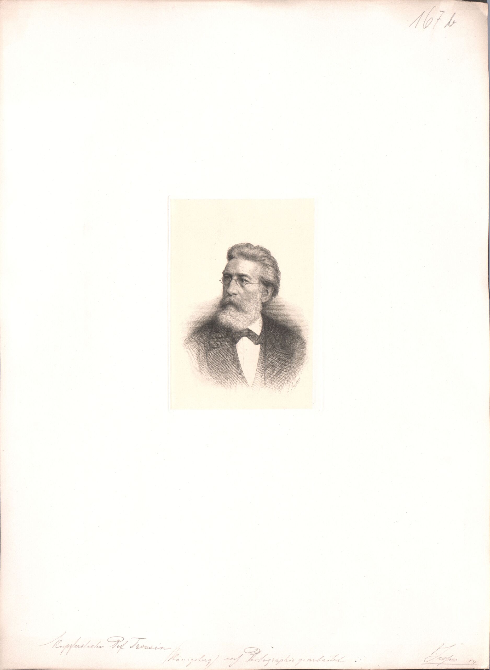 - Porträt des Kupferstechers Trossin (Königsberg), nach einer Fotografie, am unteren Bildrand mit Bleistift Signiert und datiert (vom Bearbeiter vergebener Titel)
