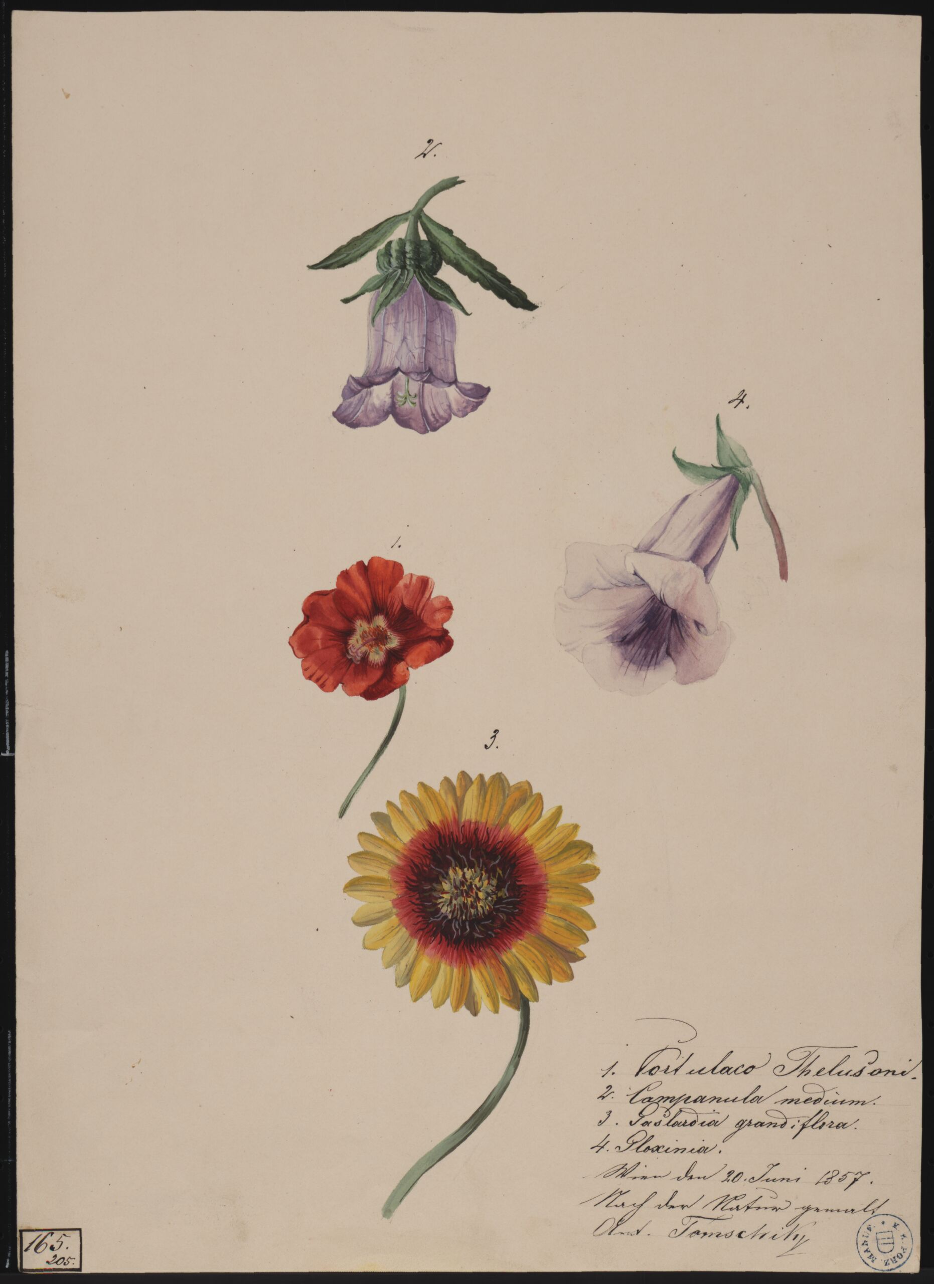 - Text am Objekt: 1. Portulaco Thelusoni / 2. Campanula medium / 3. Gailardia grandiflora / 4. Gloxinia/ Wien den 20. Juni 1857. / Nach der Natur gemalt. / Ant. Tomschik.