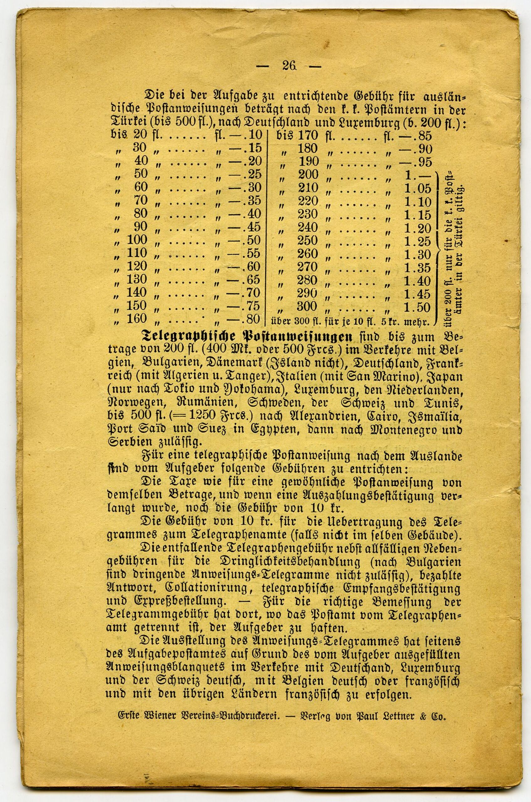 - Text am Objekt (Rückseite) : 26 / Postnachnahme=Verkehr. / Sendungen mit Postnachnahme sind sowohl im internen Verkehre Bosniens und der Herzegowina und dem / [...] / Erste Wr. Vereins-Buchdruckerei. - Verlag von Paul Lettner & Co.