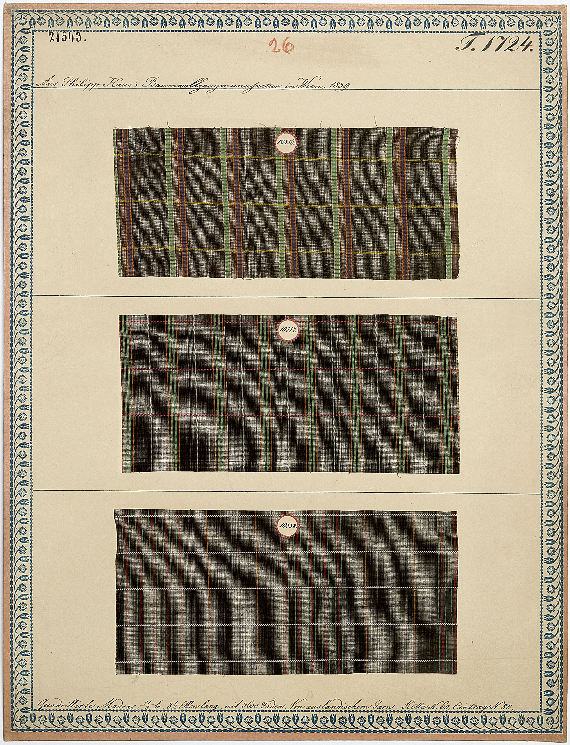 - Beschriftung (Vorderseite) : Aus der Philipp Haas's Baumwollzeugmanufactur in Wien, 1839. / Quadrillirte Madras, 11/8 br., 8,5 Ellen lang, mit 3600 Fäden. Von ausländischem Garn: Kette N. 60, Eintrag N. 80.