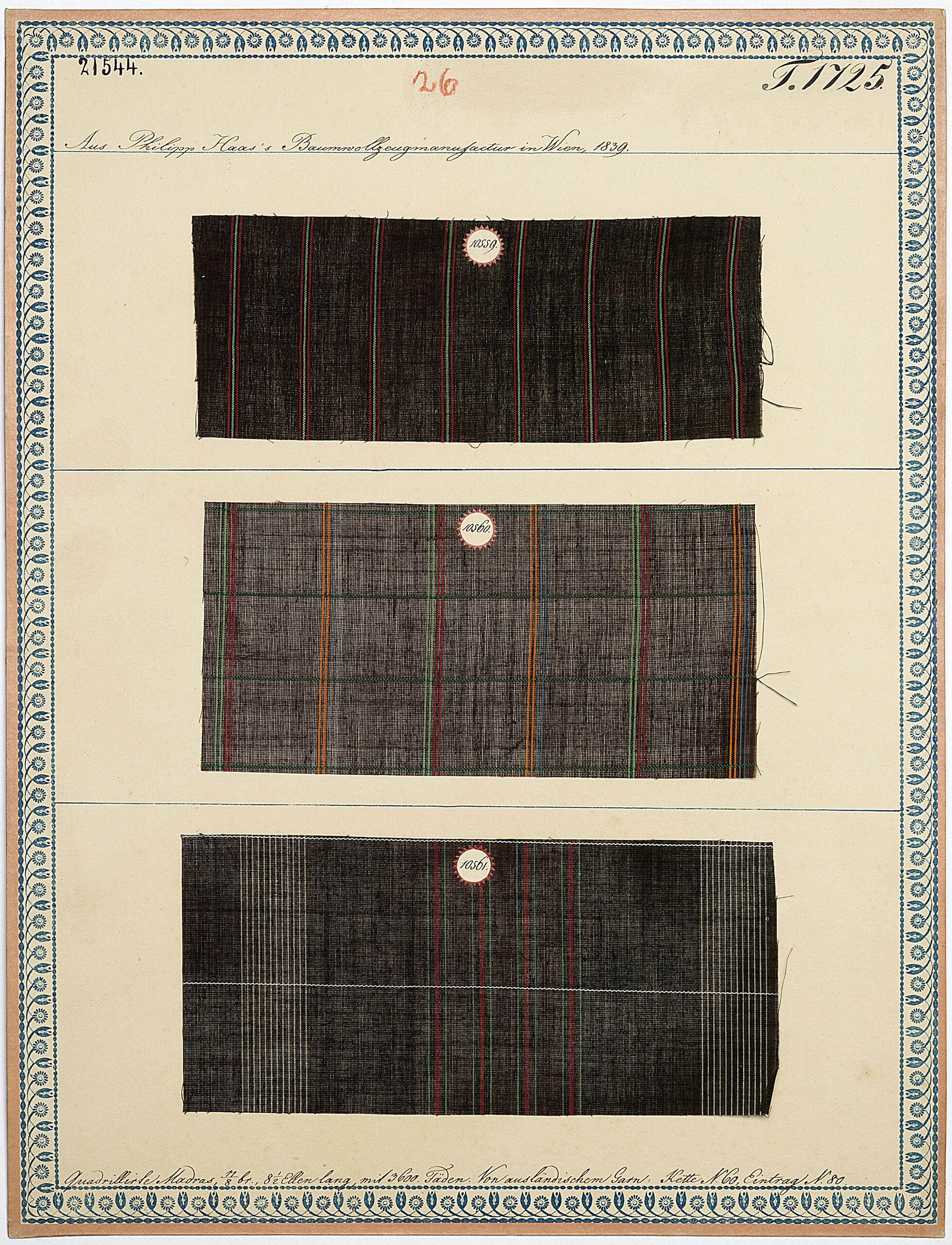 - Beschriftung (Vorderseite) : Aus der Philipp Haas's Baumwollzeugmanufactur in Wien, 1839. / Quadrillirte Madras. 11/8 br., 8,5 Ellen lang, mit 3600 Fäden. Von ausländischem Garn: Kette N. 60, Eintrag N. 80.