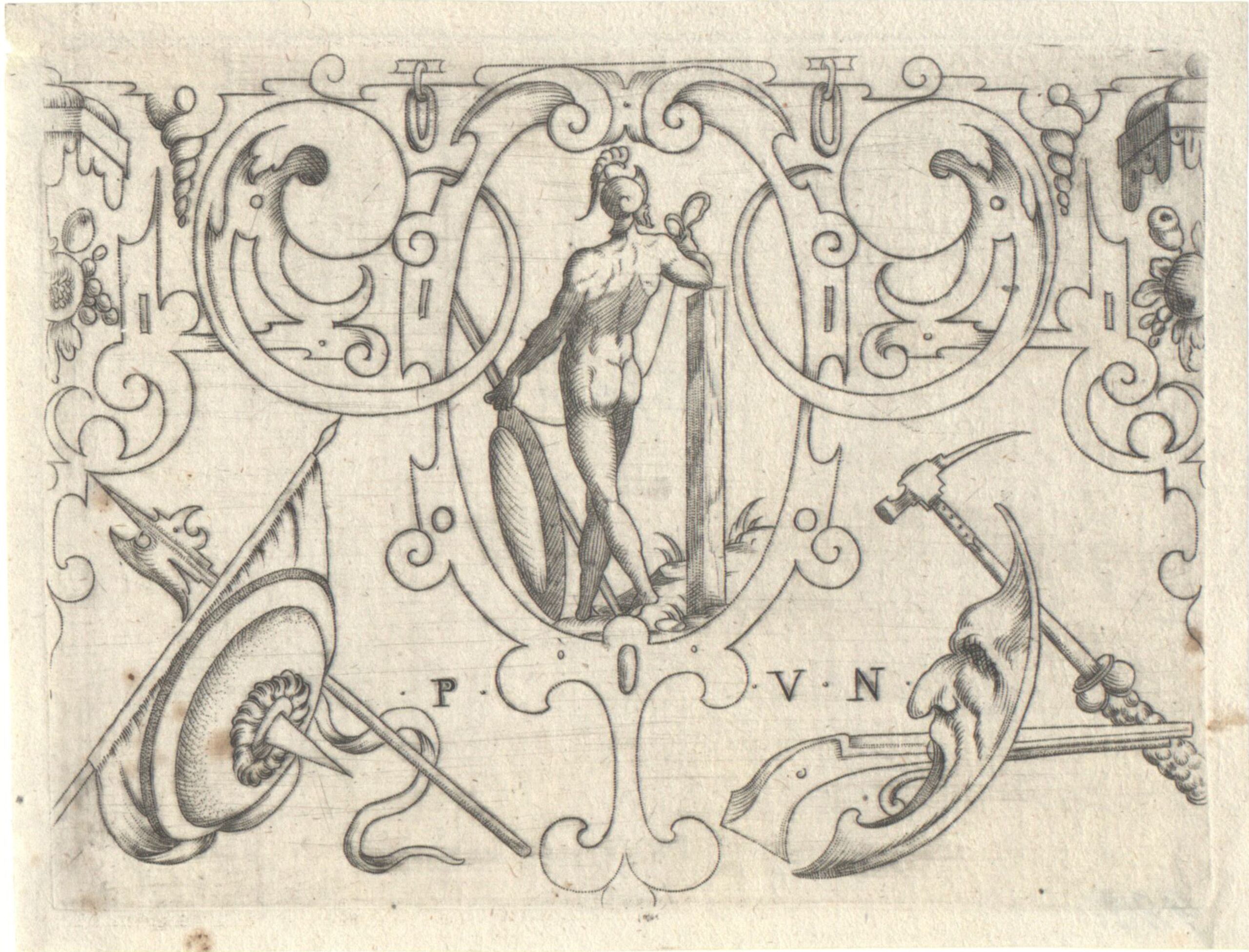 Ornamentstich, Randverzierung mit Schweifwerk, einem Medaillon mit der Rückenansicht eines nackten Kriegers und Trophäen, Paulus Flindt, MAK Inv.nr. KI 988-1