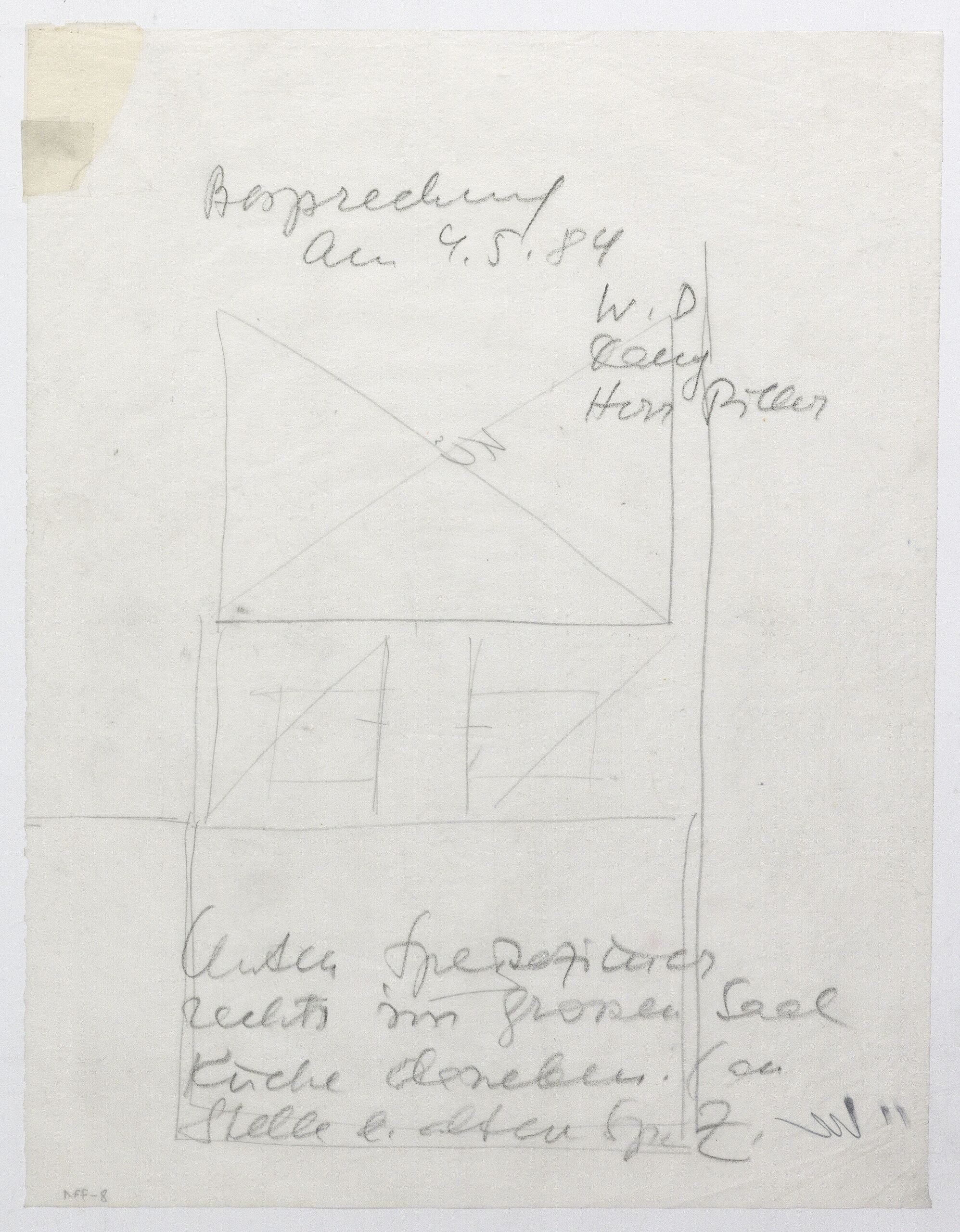 - Beschriftung: Besprechung am 4.5.84 / W.D / Dany / Herr Piller / Unten Speisezimmer / rechts im großen Saal / Küche daneben. (an / Stelle d. alten Sp.Z.)