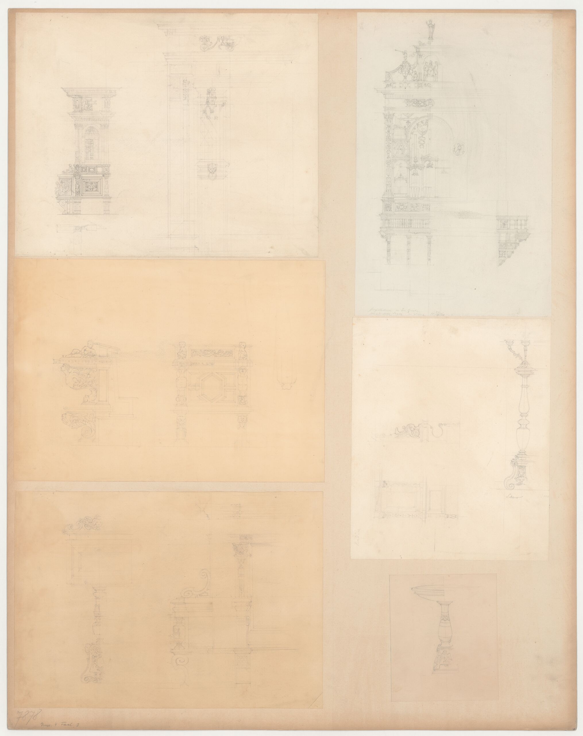 Reiseskizze, Reiseskizzen von Valentin Teirich aus Italien. Sammlung von reichen Schnitzarbeiten in Holz an einem Chorstuhl, einem Lesepult sowie einer Tür. Zudem Skizzen eines Weihbeckens, eines Leuchters aus San Marco, sowie vom Orgellettner in Santa Maria della Scala in Siena , Valentin Teirich, MAK Inv.nr. KI 7878-98