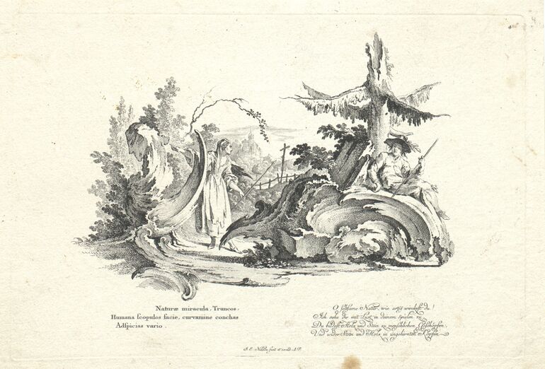 - Rocaille- Kartusche mit Kindern, Blatt 4 aus der Folge „Cartouches modernes accompagnés par des Enfans“, herausgegeben von J. E. Nilson, Verlagsnummer VII (7. Folge des von Nilson verlegten Reihenwerks mit 69 Folgen) (vom Bearbeiter vergebener Titel)