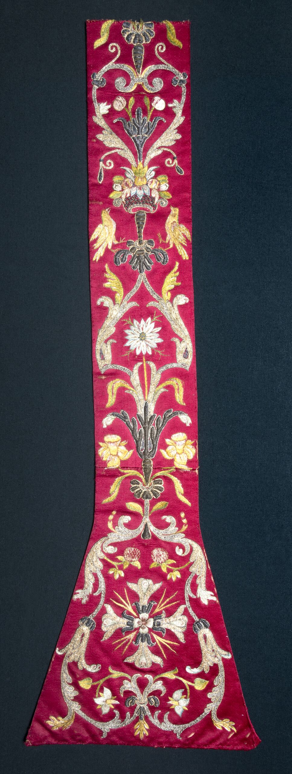 - Roter Atlas mit Gold-, Silber und bunter Seidenstickerei (deskriptiver Titel)