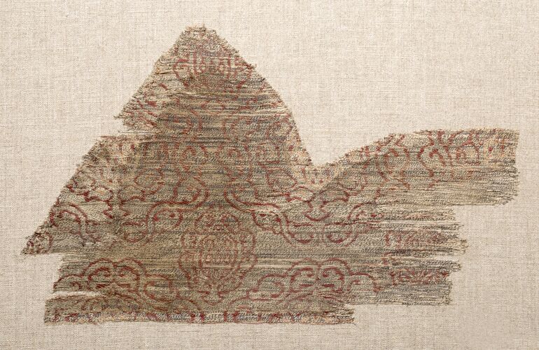 - Roter Samt mit Granatapfelmuster und Silberbroschierung (deskriptiver Titel)