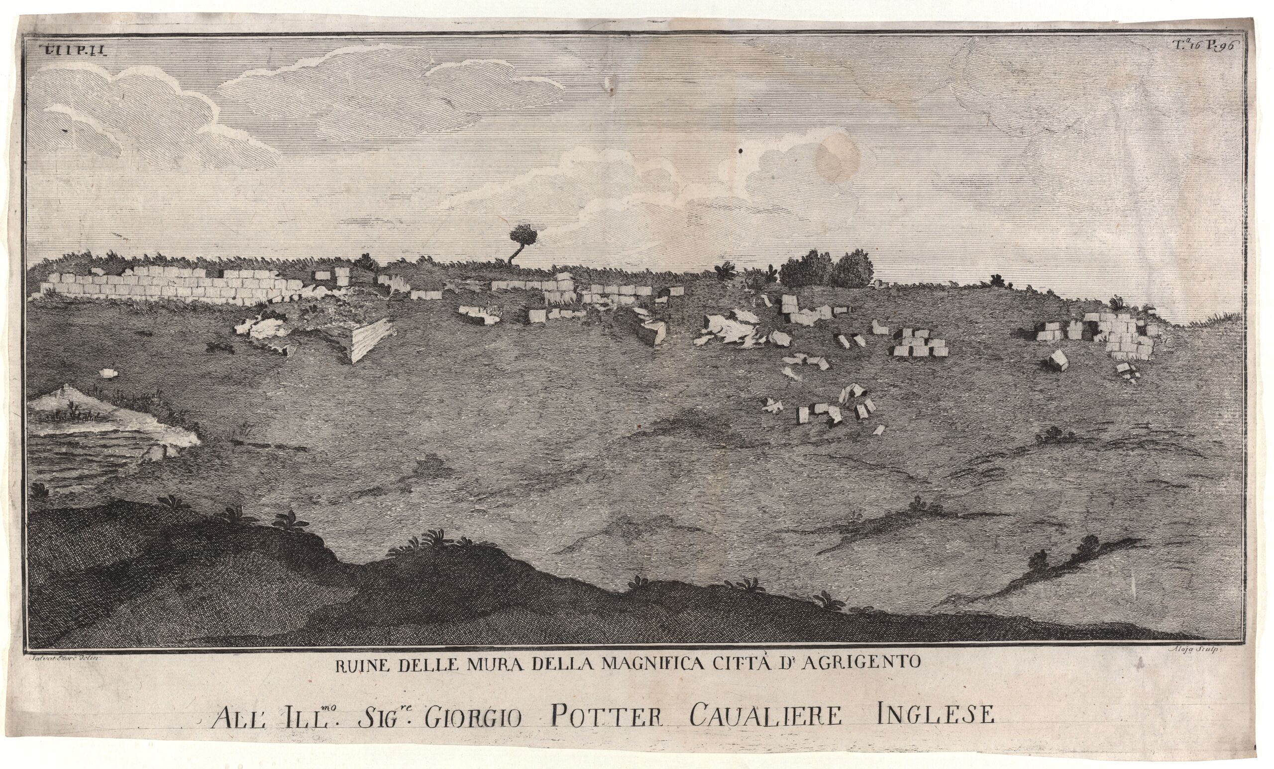 - Text am Objekt: Ruine delle mura della magnifica citta d’ Agrigento / All’ Ill.mo Sig.re Giorgio Potter Cavaliere Inglese / Salvat. Ettore delin, Aloja Sculp.
