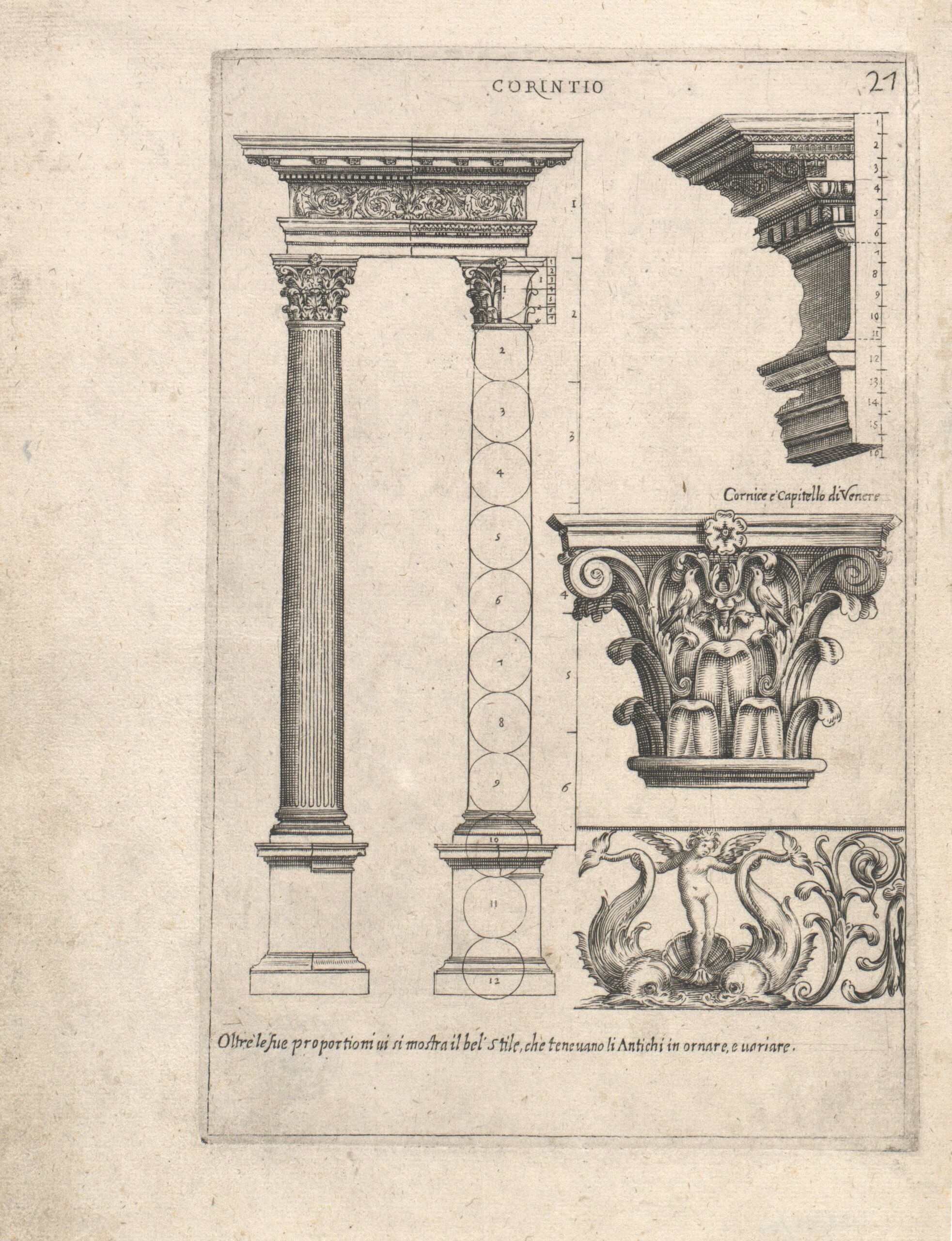 - Säulen, Gesims, Kapitell und Fries korinthischer Ordnung, Blatt 27 aus der Folge „Architettura con diversi ornamenti cavati dall’antico da Gio. Battista Montano Milanese etc.”, herausgegeben von Callisto Ferrante (vom Bearbeiter vergebener Titel)