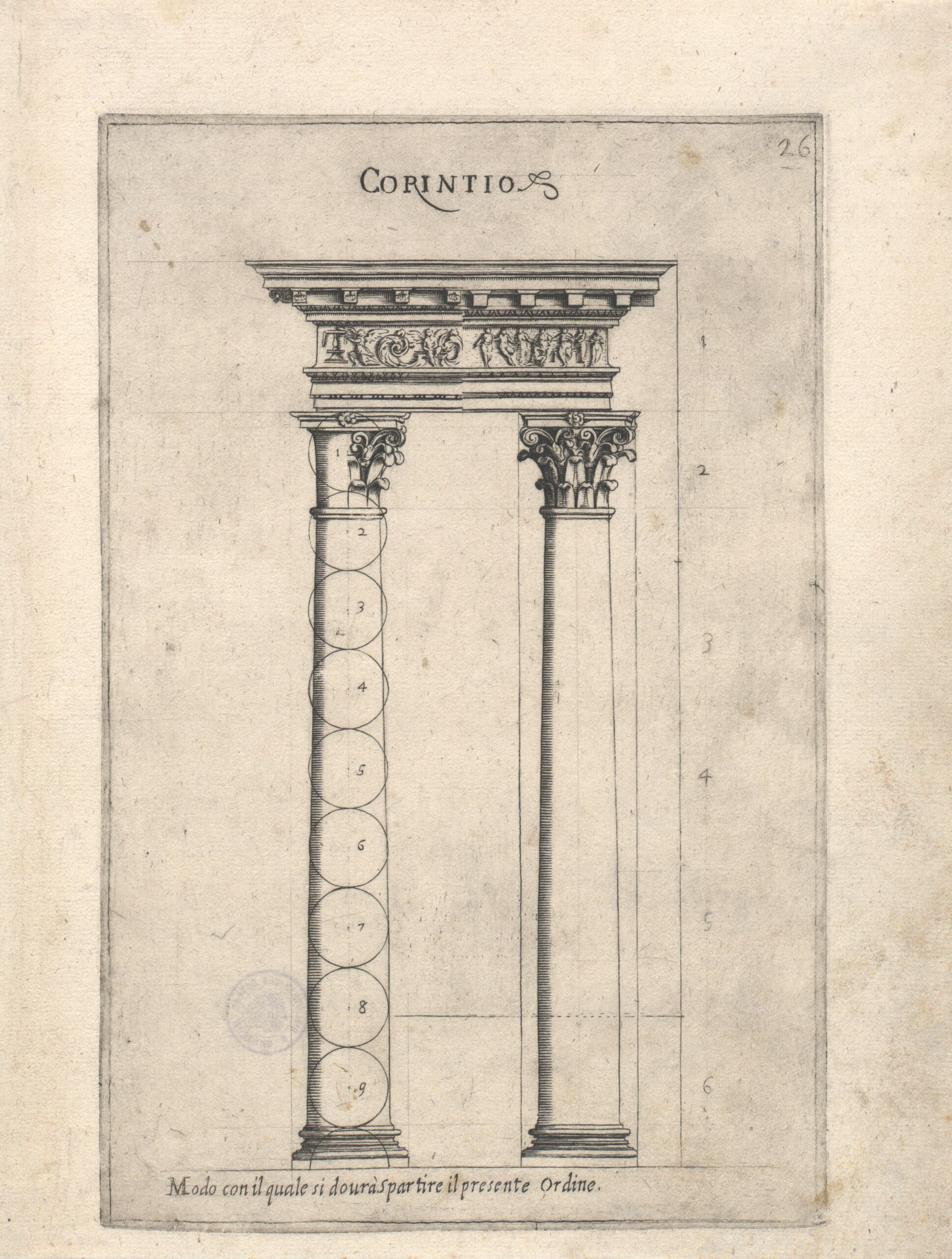 - Säulen und Gesims korinthischer Ordnung, Blatt 26 aus der Folge „Architettura con diversi ornamenti cavati dall’antico da Gio. Battista Montano Milanese etc.”, herausgegeben von Callisto Ferrante (vom Bearbeiter vergebener Titel)