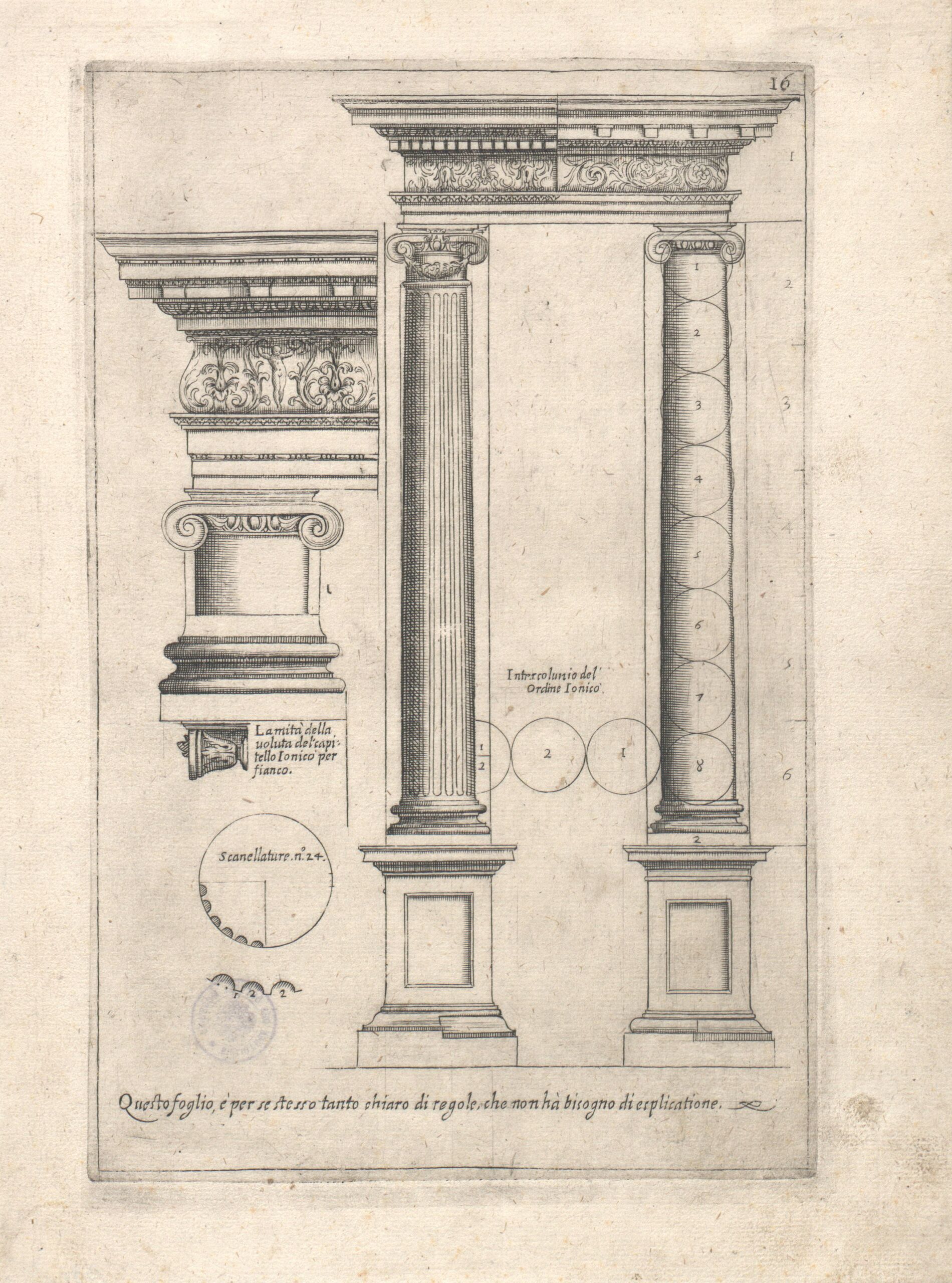 - Säulen und Gesimse, Blatt 16 aus der Folge „Architettura con diversi ornamenti cavati dall’antico da Gio. Battista Montano Milanese etc.”, herausgegeben von Callisto Ferrante (vom Bearbeiter vergebener Titel)