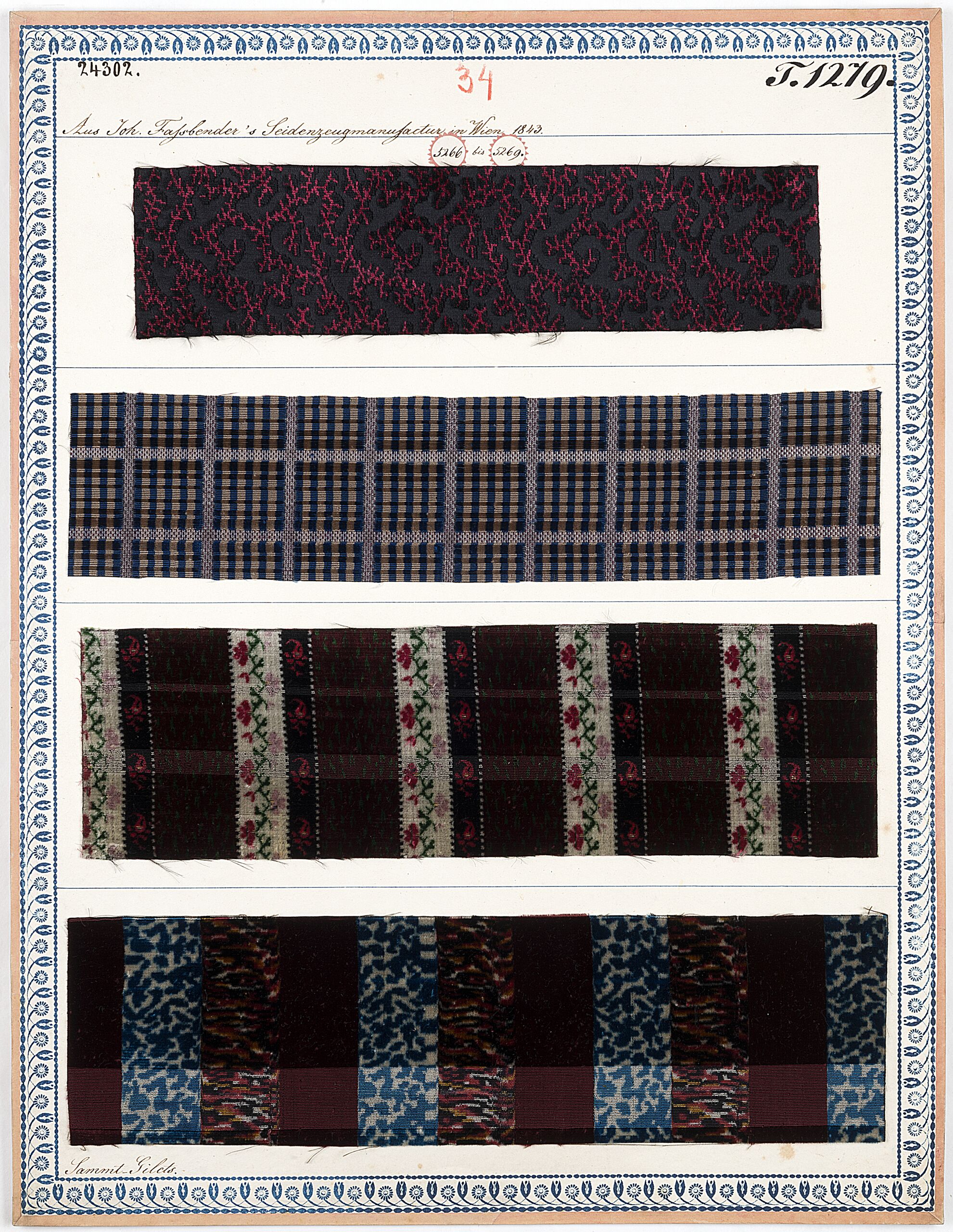 - Beschriftung (Vorderseite) : Aus Johann Fassbender's Seidenzeugmanufactur in Wien, 1843. / Sammt-Gilets.
