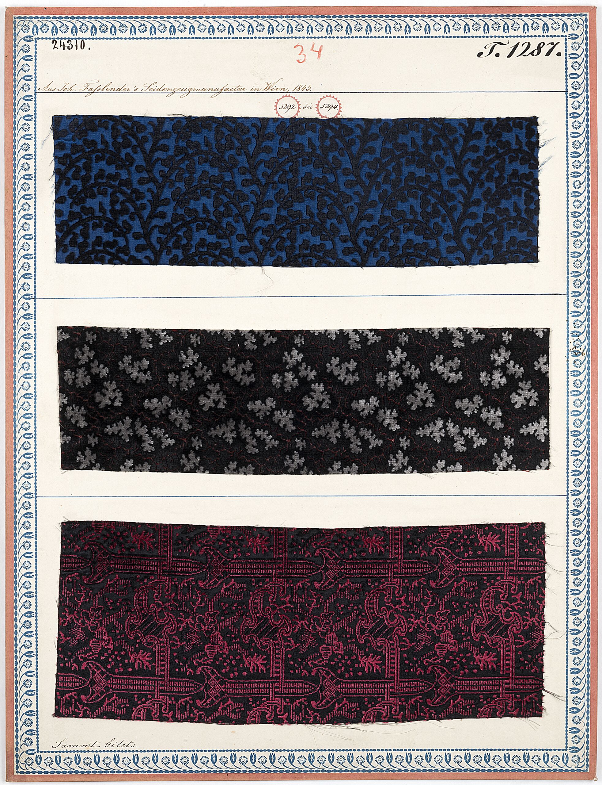 - Beschriftung (Vorderseite) : Aus Joh. Fassbender's Seidenzeugmanufactur in Wien, 1843. / Sammet-Gilets.