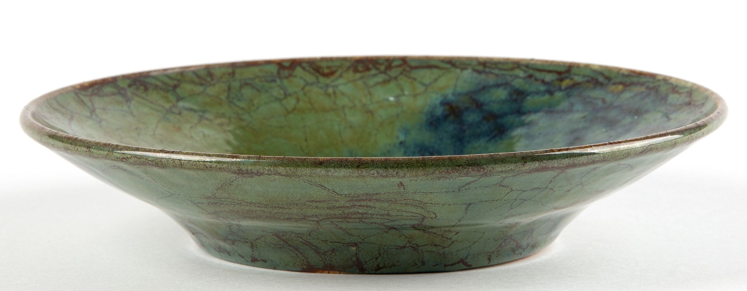 Schale, flach ausladend, Ton, hellgelber Scherben, getöpfert, glasiert, grünblaue Laufglasur, mit dunkelrotem/braunem Craquelé