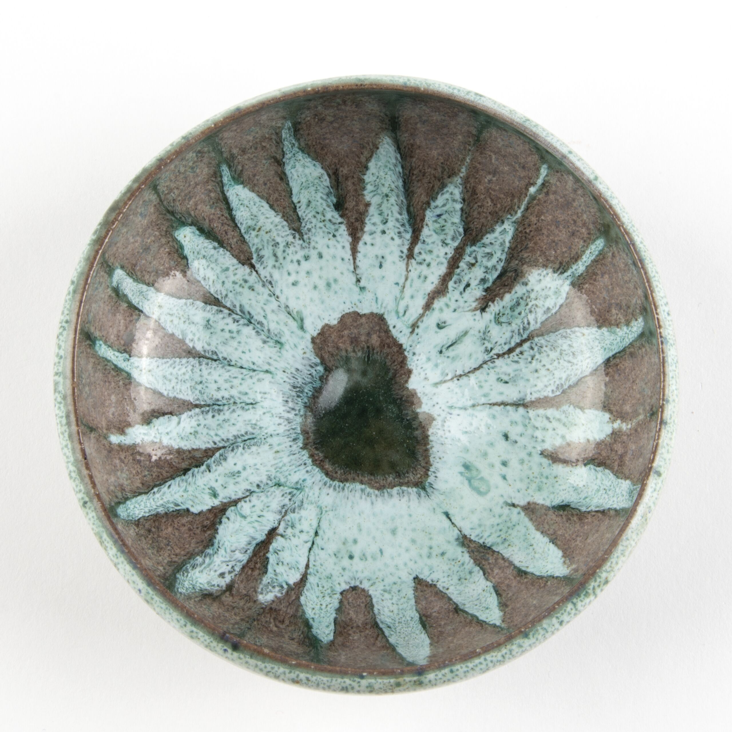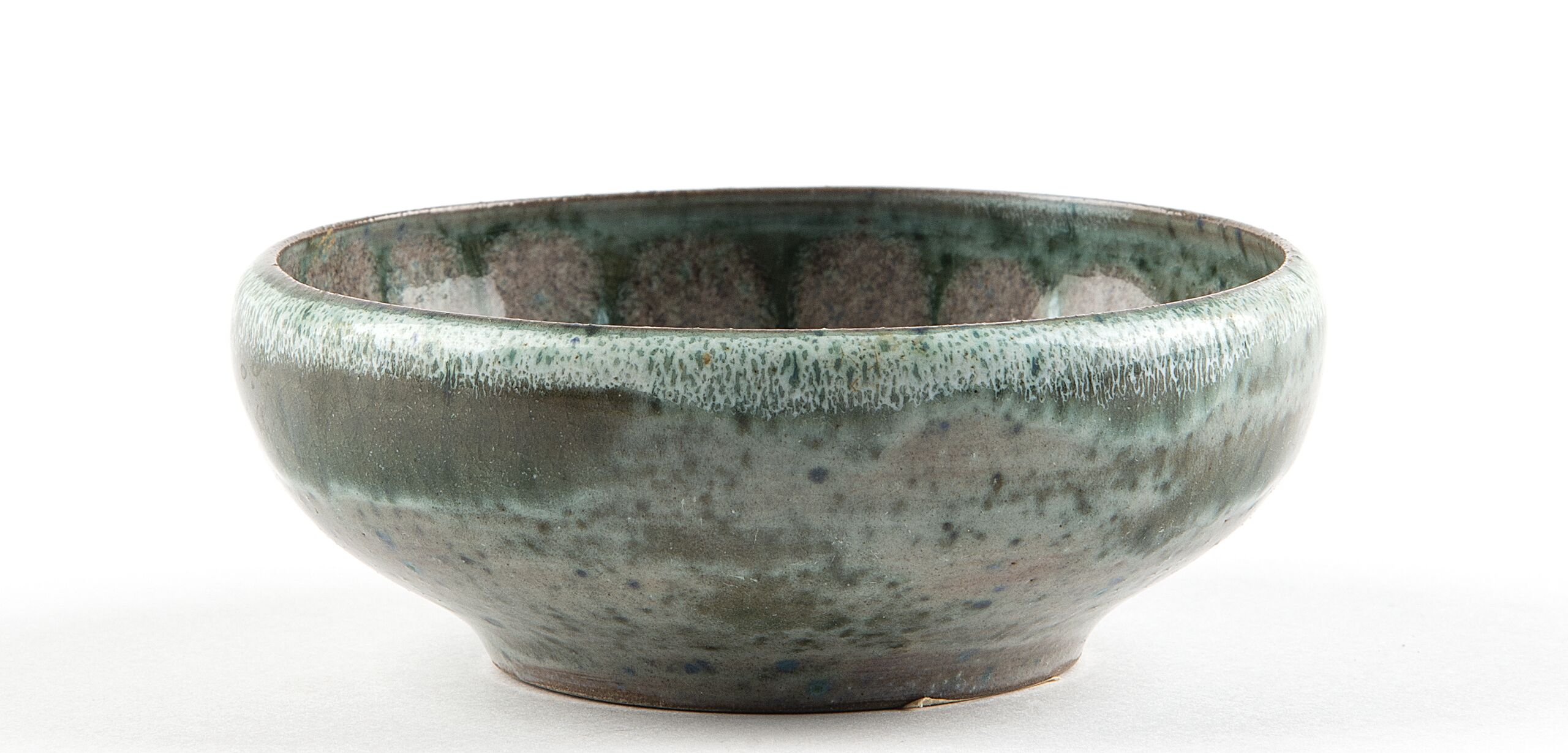 Schale, Ton, graubrauner Scherben, getöpfert, glasiert, grüngraue Glasur mit blauen Punkten, innenaltrosa/grün, mit weißer Glasur strahlenförmig gestaltet