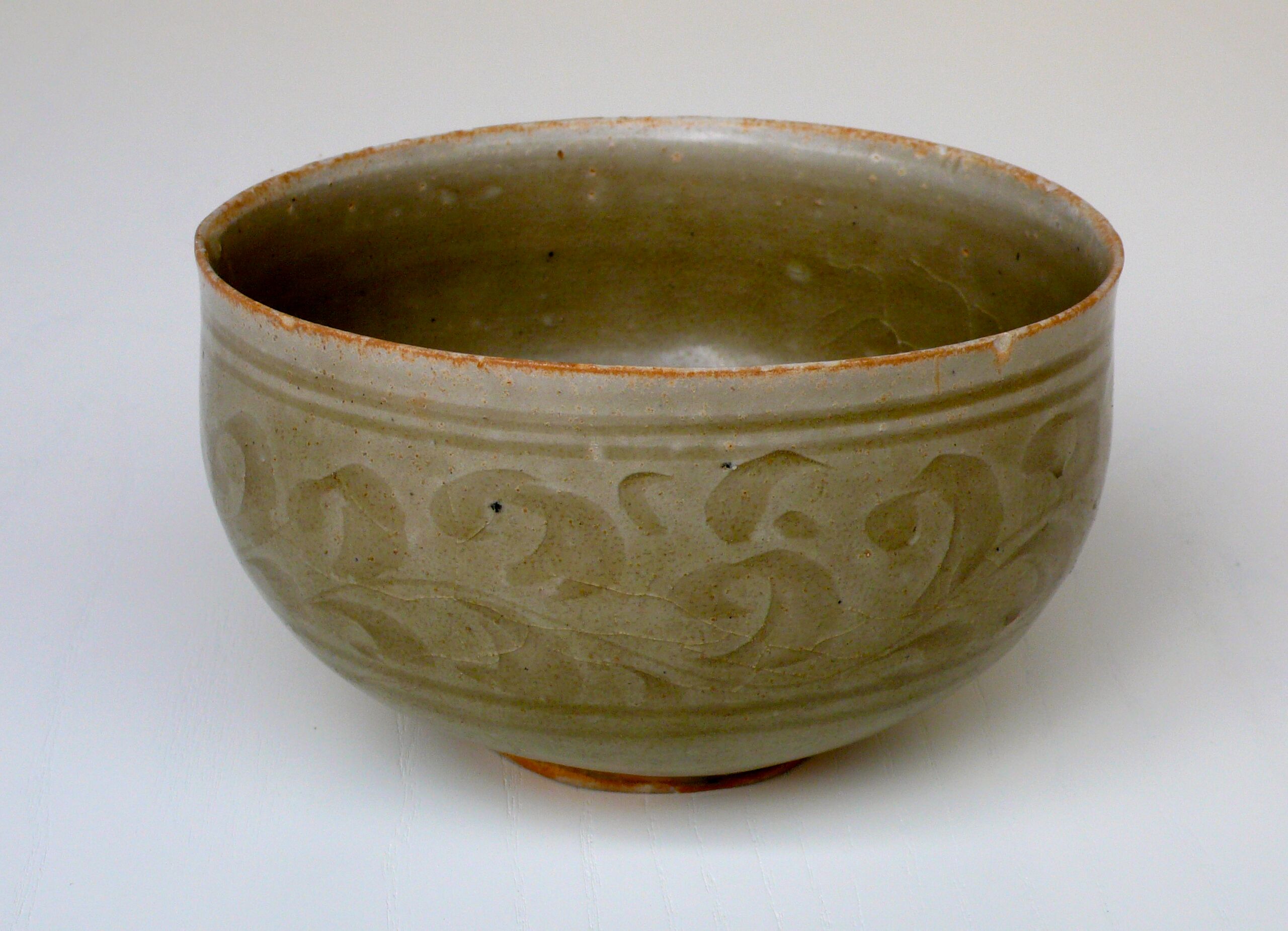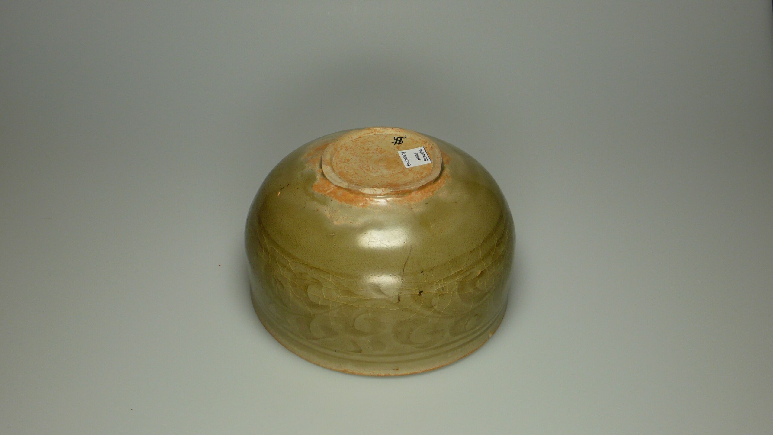 mit ausgeschabtem floralem und Ritzdekor unter teils krakelierter Seladonglasur