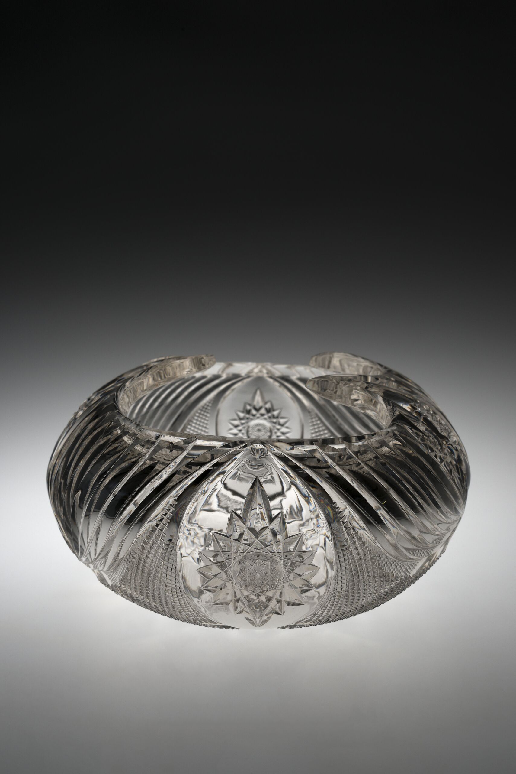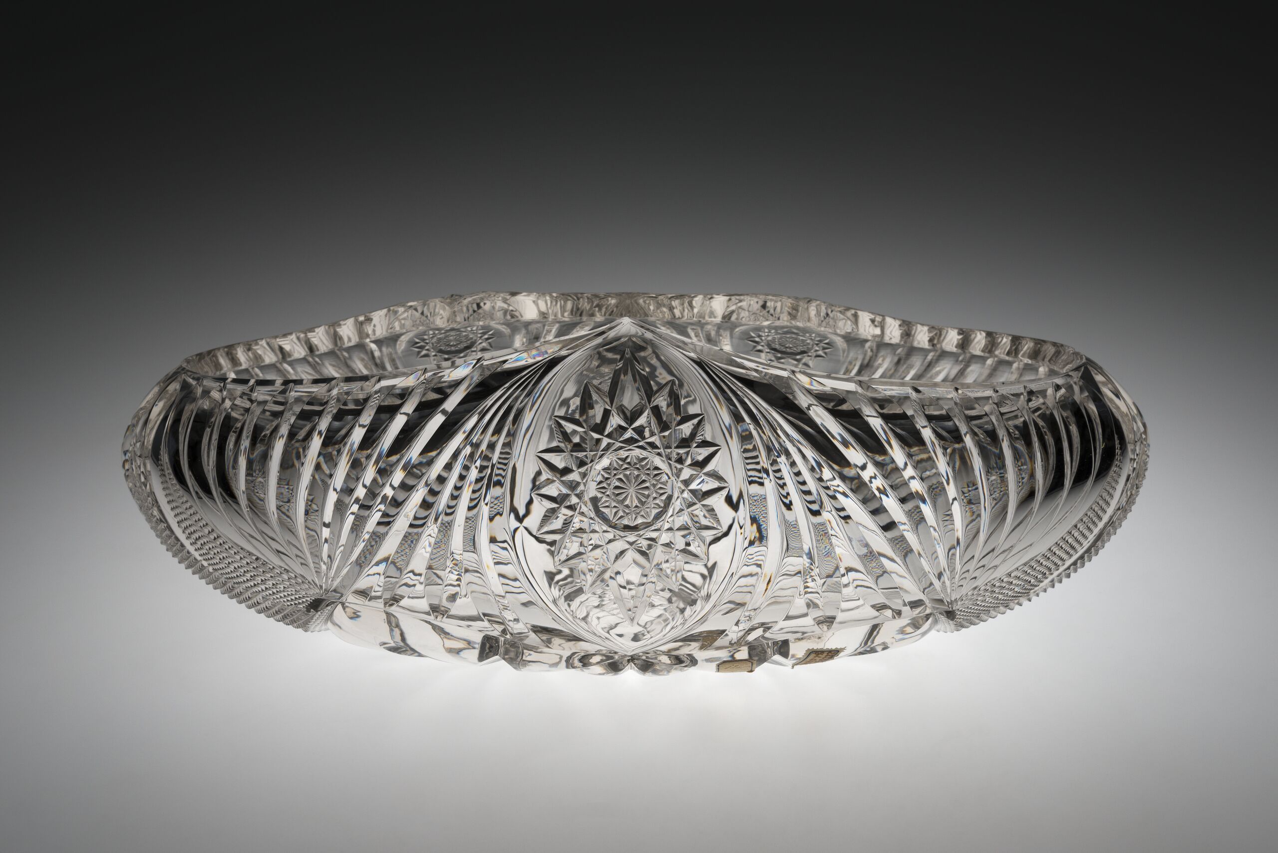 Große ovale Kristallglasschale für Blumen. Oben eingewölbt mit drei Zacken. Reicher Schliff. Spitzovalfelder mit Sternreihen, dazwischen Fächerschliff und Steindelfelder. Am Boden Sternrosette