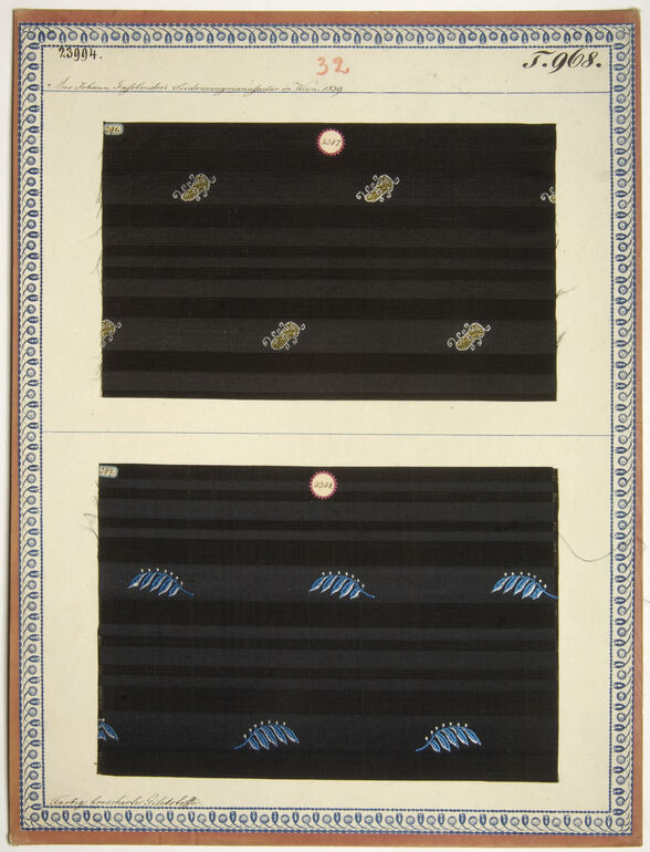 - Beschriftung (Vorderseite) : Von dem Seidenzeugfabrikanten Sebast. Karglin Wien, 1820. / Schaltüchern aus Baumwolle und Seide.