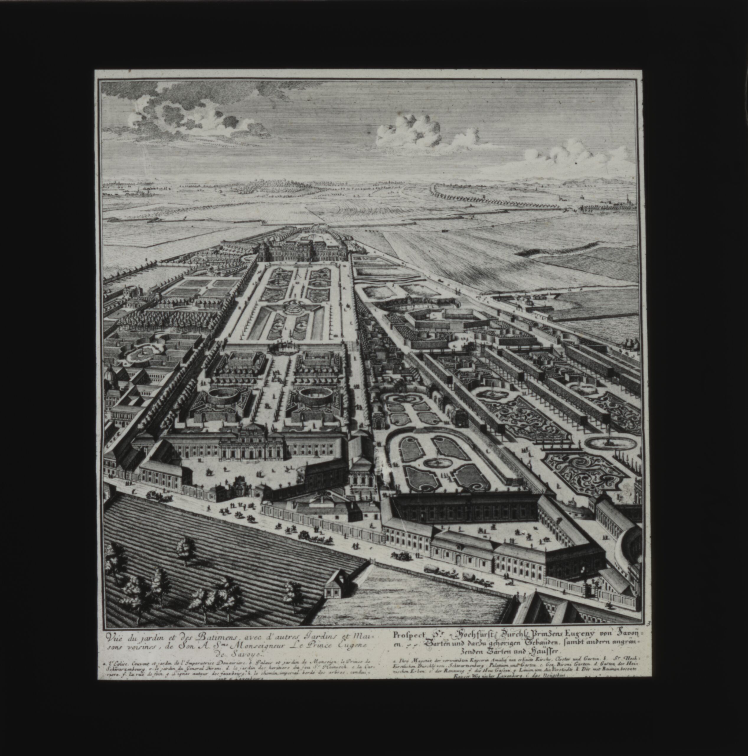 - Text am Objekt: Vue du jardin et des Batimens, avec d'autres Jardins et Maisons voisines, de Son A. Sme Monseigneur Le Prince Eugene de Savoye [...] Prospect Sr. Hochfürstl. Durchs; Prinzens Eugeny von Savoijen ec. ec. Garten und darzu gehörigen Gebaüden, sambt andern angränzenden Gärten und Haüsser [...]