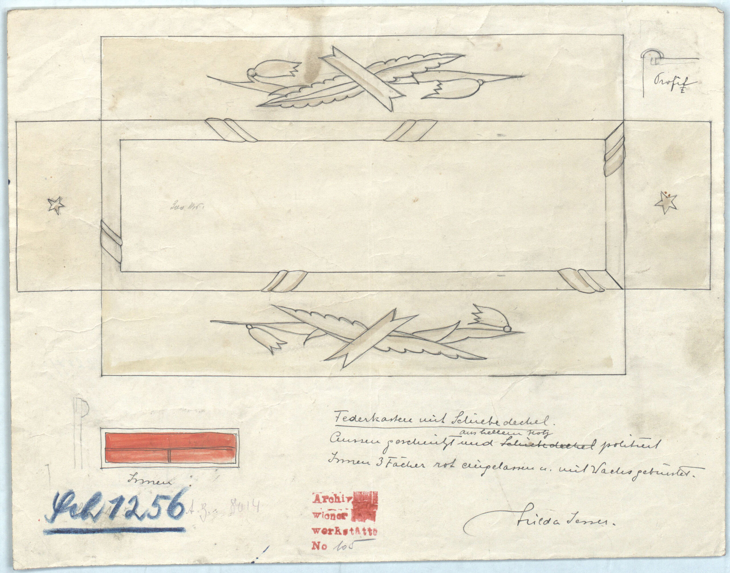 - Text am Objekt: Federkasten mit Schiebedeckel./Aussen geschnitzt aus hellem Holz und politiert/Innen 3 Fächer rot eingelassen u. mit Wachs gebürstet./Profil/InnenHilda Jesser