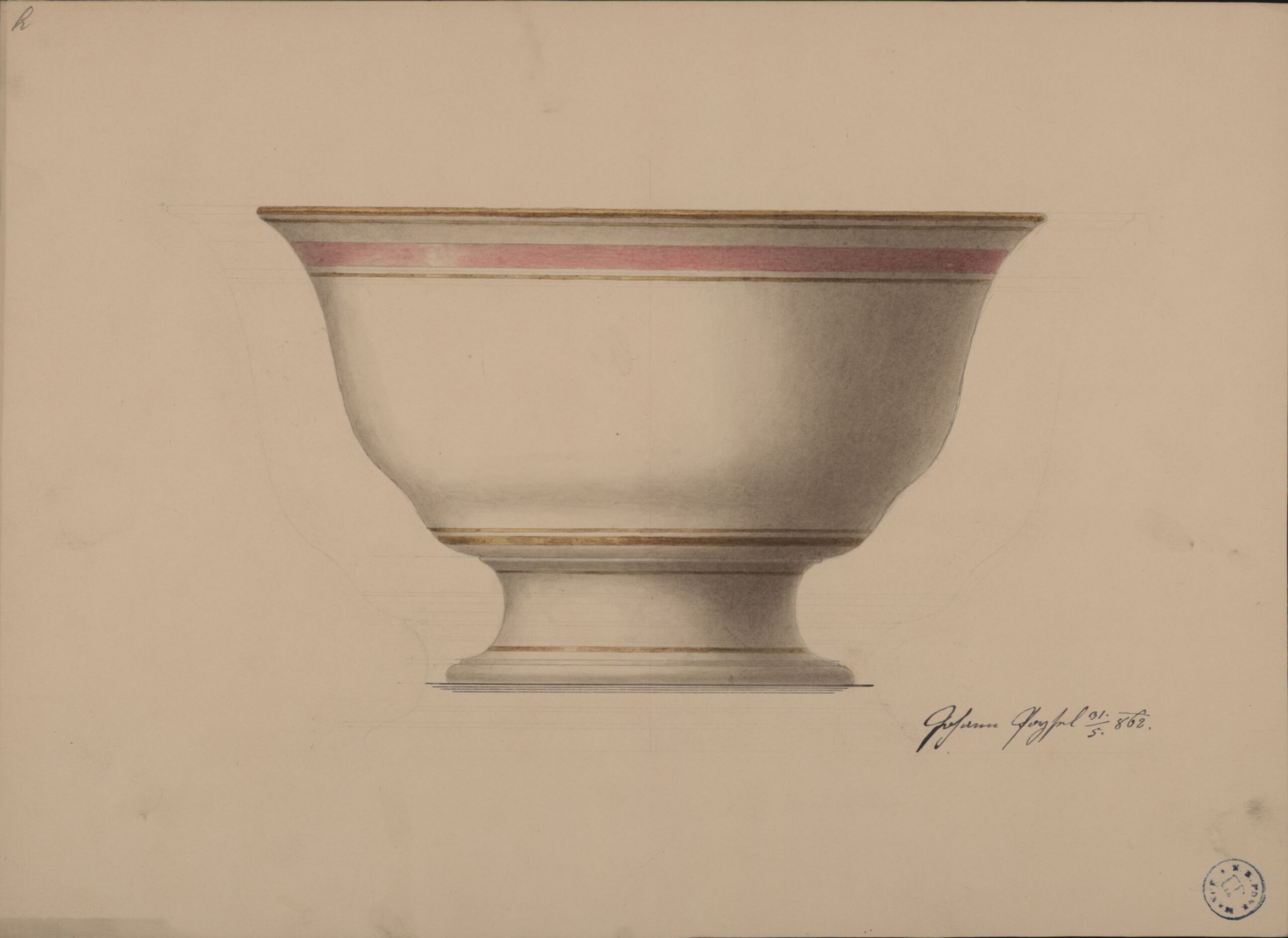 hohe Schüssel mit Fuß, bandförmiger Dekor in Gold und Rosa