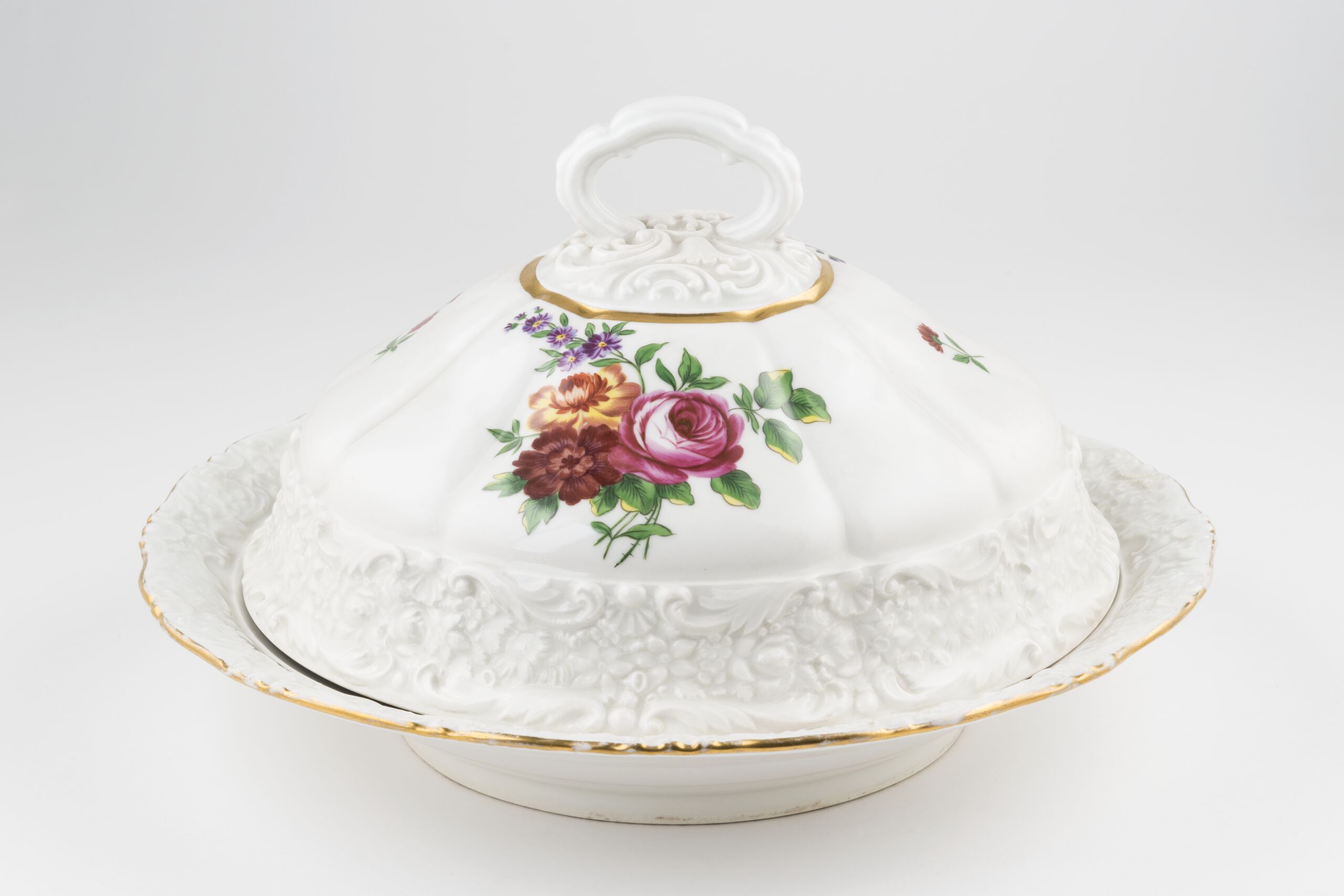 Wärmeglocke, Runde Schüssel mit leicht gewelltem, reliefierten Rand, im Fond bunte Blumen. Glockenförmiger Deckel mit Henkelgriff, reliefierter Rand, bunte Blumenbuketts