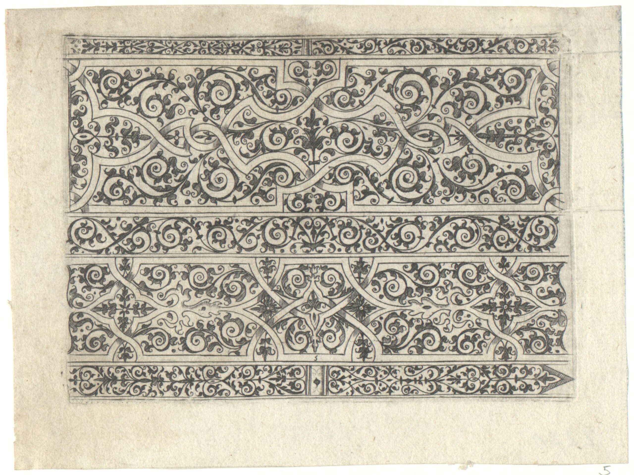 - Schweifwerkarabeske mit Bandelwerk, Blatt 5 aus der Folge „Une Livre contenant Passement de Moresques etc.“ (vom Bearbeiter vergebener Titel)