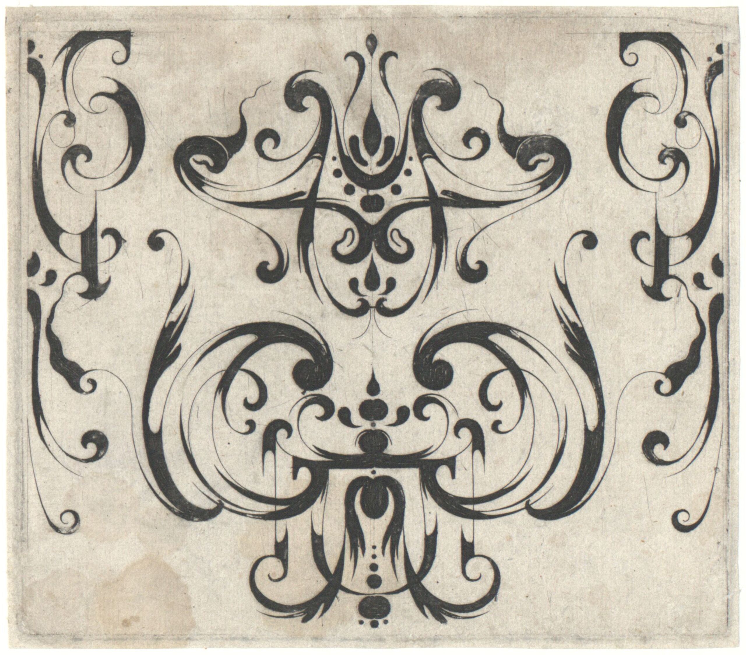Erster Zustand vor Blattnummerierung. Die Blätter in Wien sind aufgenommen im Kommentar von Fuhring unter Nr. 1270. Es gibt wahrscheinlich zwei Serien, beide selten, und das Titelblatt laut: Grateske boer golt smeden Schrijnwerkers, Ende andere des noedlich hebbende, Meinert Gelijs Schulp et excud. [Grotesken Büchlein für Goldschmieden und Möbelschreiner und andere die es gebrauchen können].