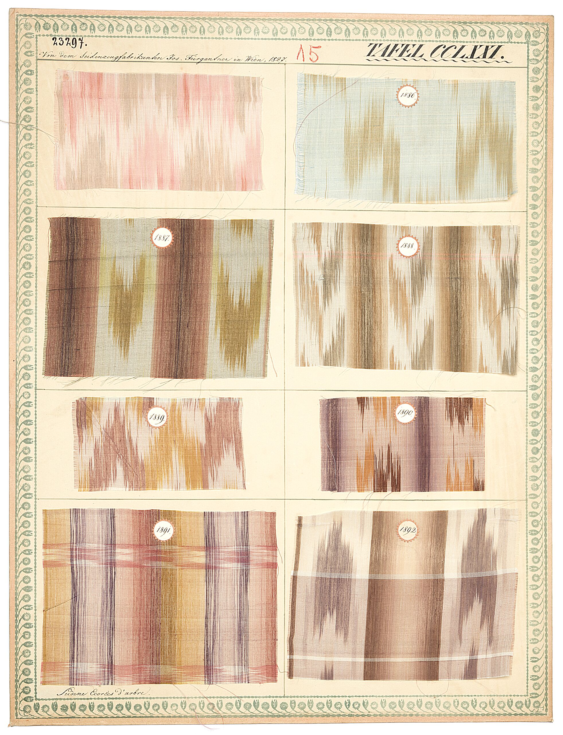 - Beschriftung (Vorderseite) : Von dem Seidenzeugfabrikanten Jos. Fürgantner in Wien 1827. / Seidene Ecorces d'arbre.