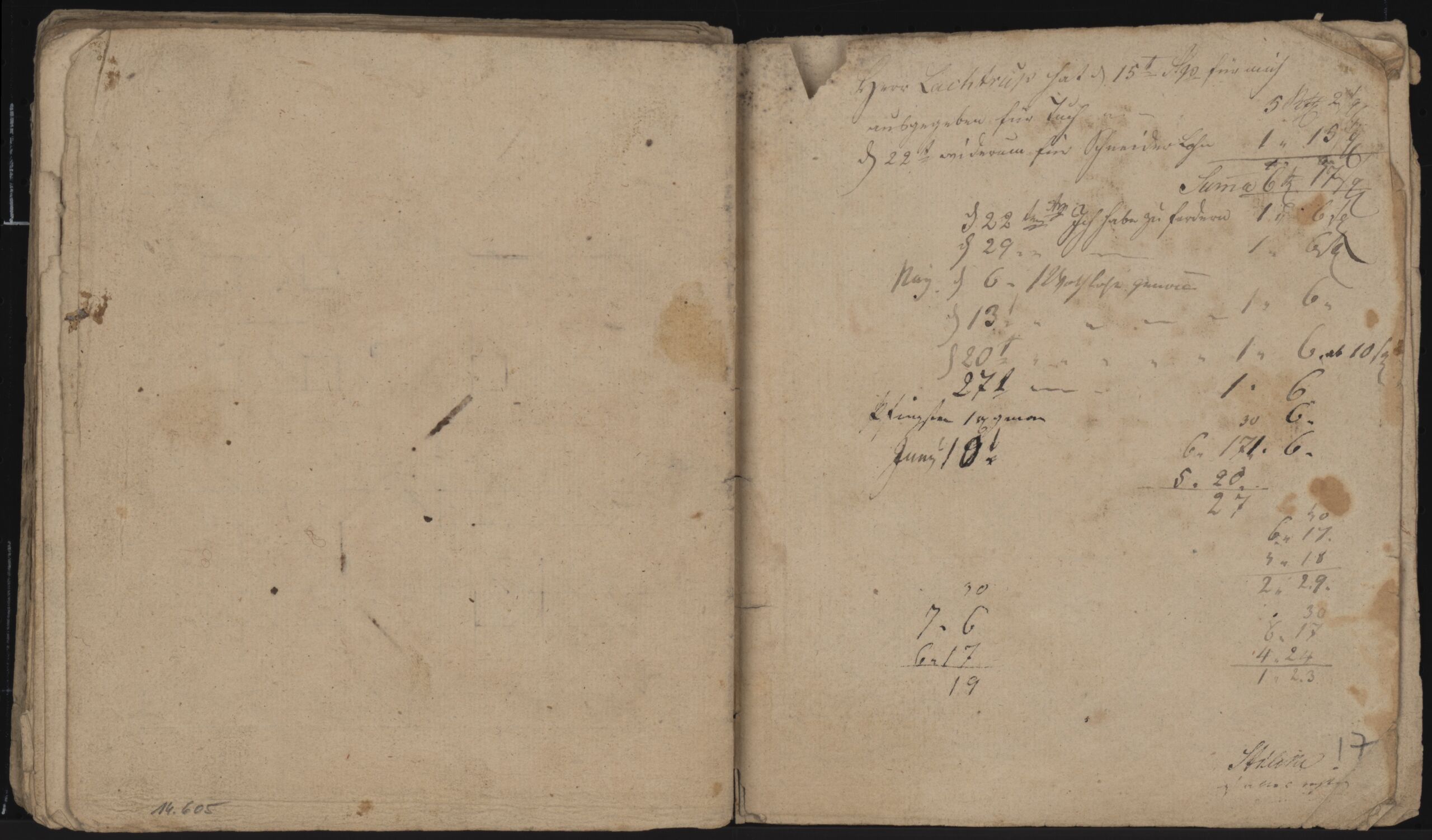 - Text am Objekt: Herr Lachtrupp hat den 15t April für mich / ausgegeben für Tuch ... 5 kr. 2 pf. / den 22. wiederum für Schneiderlohn 1 " 15 pf / Summe 6 kr 17pf / den 22ten Ap Ich habe zu fordern 1" 6 pf / den 29. " 1 kr. 6 pf / May den 6. " 1 Wochenlohn genommen / den 13t " 1" 6" / den 20t " " 1" 6 " ab 10 pf / 27 t " 1" 6" / Pfingsten 1 K genom 30 6" / Juni 10 6" 17" 6" / 5" 20 " / 27 / 30 / 6" 17" / 4" 18" / 2" 29" / 30 / 6" 17 / 4" 24 / 1" 23 / Stilke / alles richtig [Feder in Schwarz]