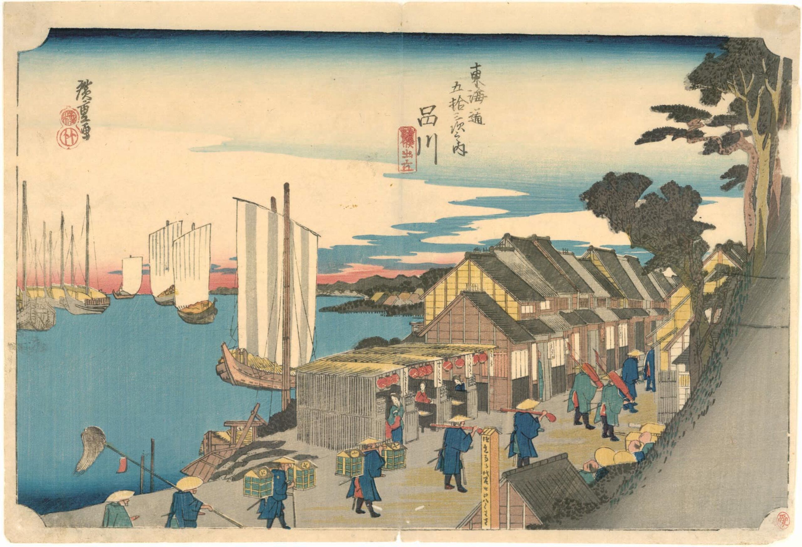 Blatt 2, Station 1. Shinagawa 品川 ist die erste Station nach der Nihon-Brücke (Nihon-bashi 日本橋) auf der Tōkaidō. Die Station war das Eingangstor nach Edo und voller Teehäuser, Restaurants und Geisha-Häuser. Auf der Straße ist das Ende eines daimyō-Zuges (daimyō gyōretsu 大名行列) zu sehen und rechts Reisende, die sich an den Wegesrand gestellt haben, um dem Zug Platz zu machen.