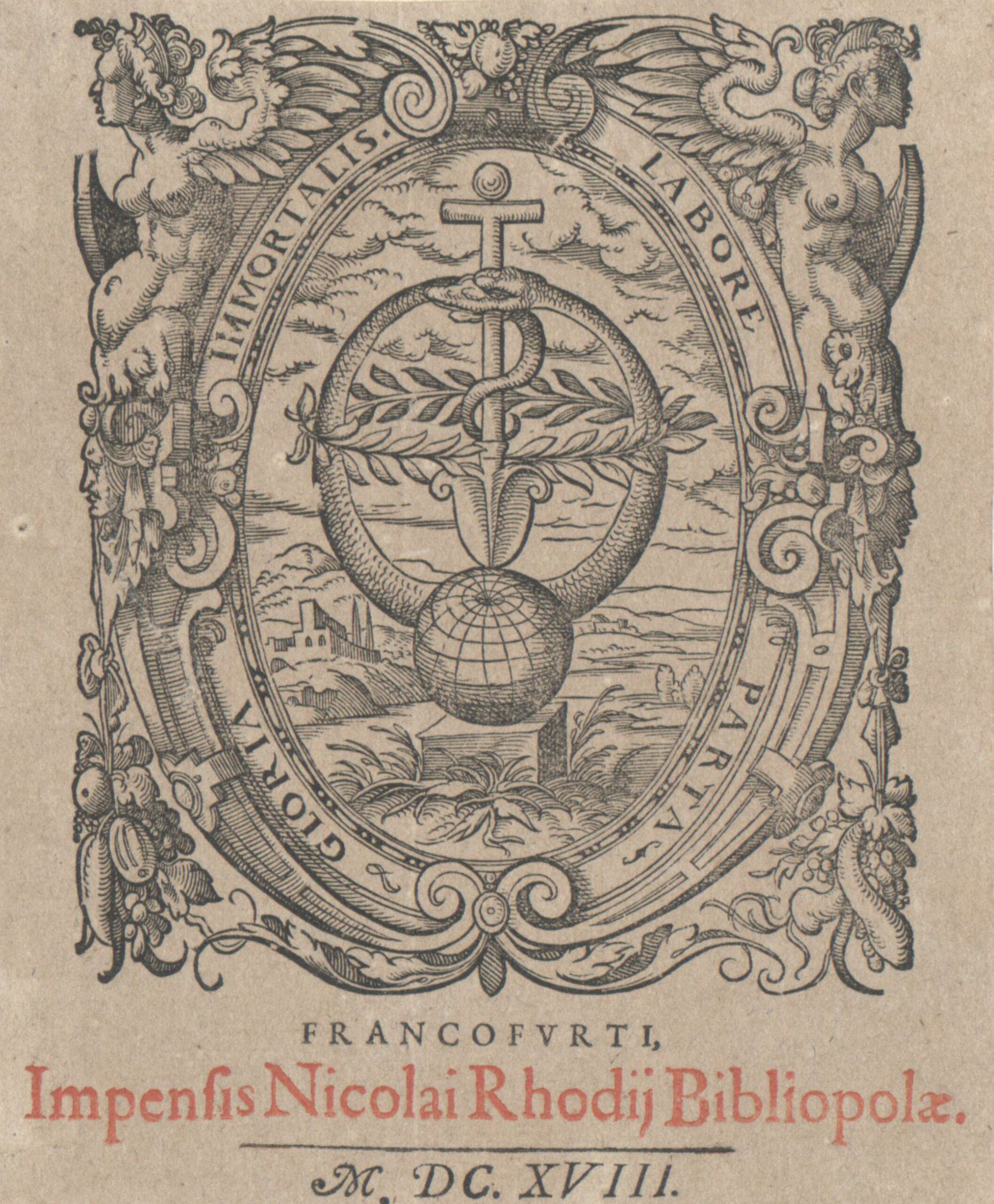 - Text am Objekt: LABORE PARTA GLORIA INMORTALIS / FRANCOFURTI,/ Impensis Nicolai Rhodij Bibliopolae / MDCXVIII