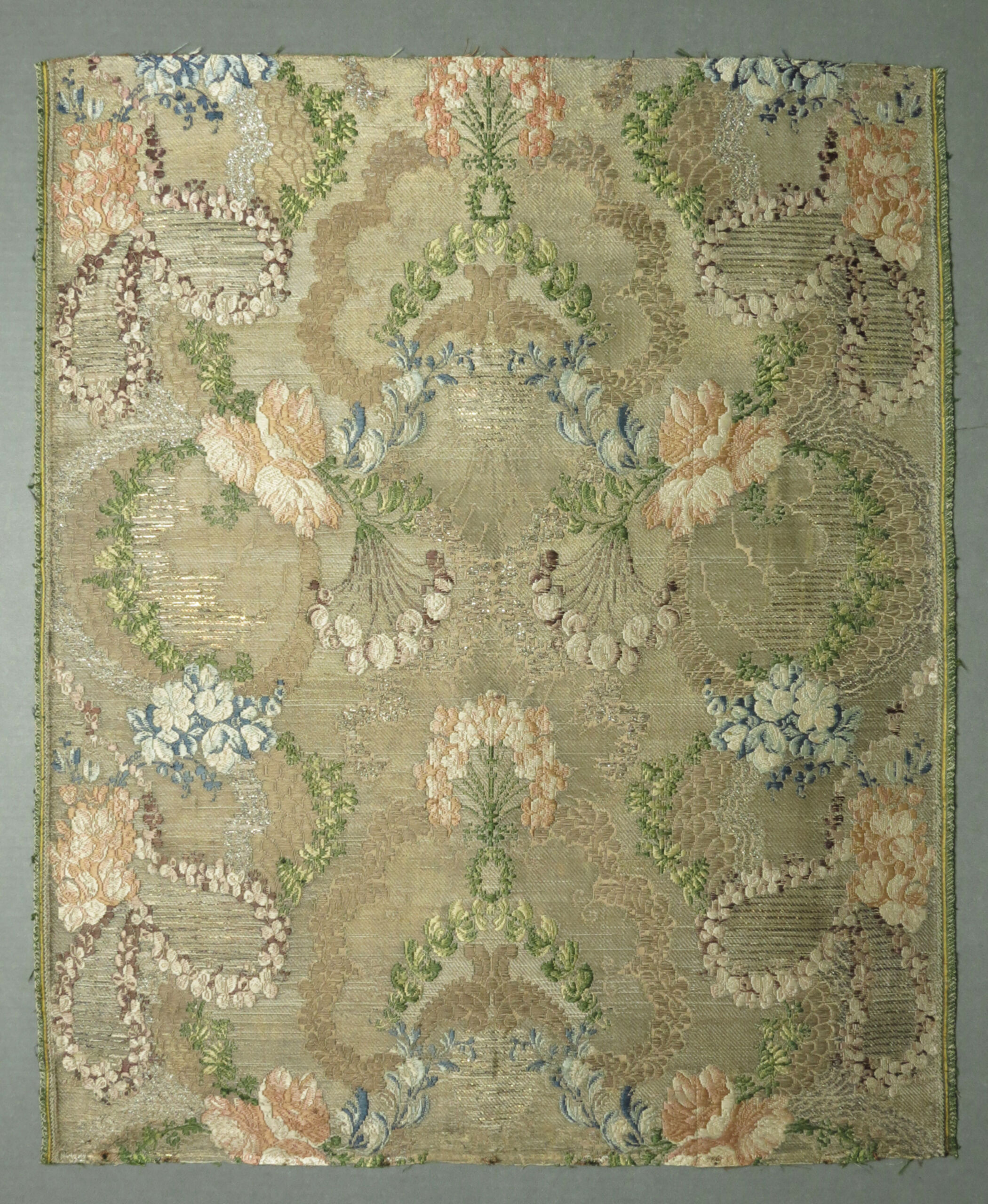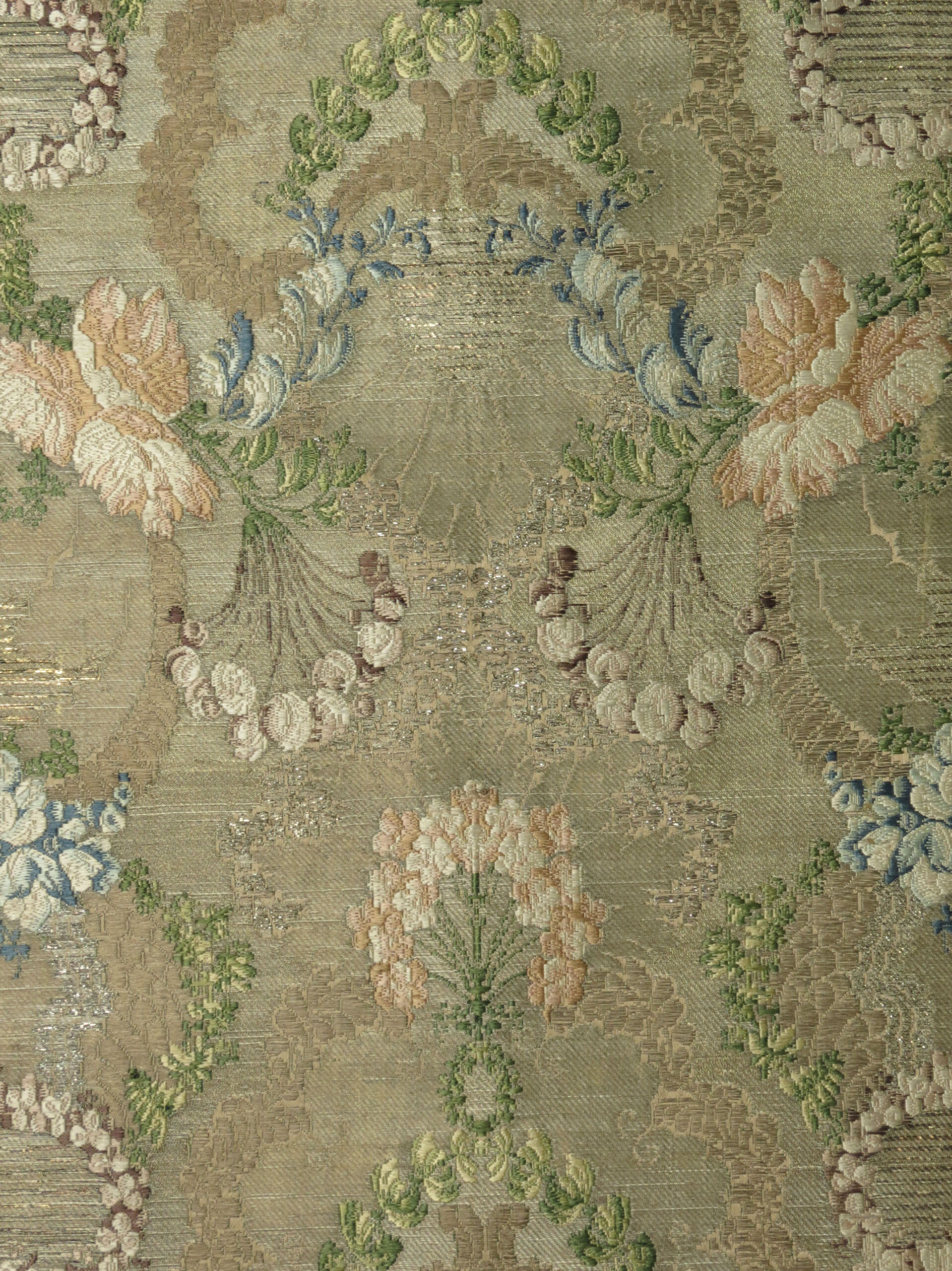 - Silber mit Blumenranken in grün, lachs, blau und braun (deskriptiver Titel)